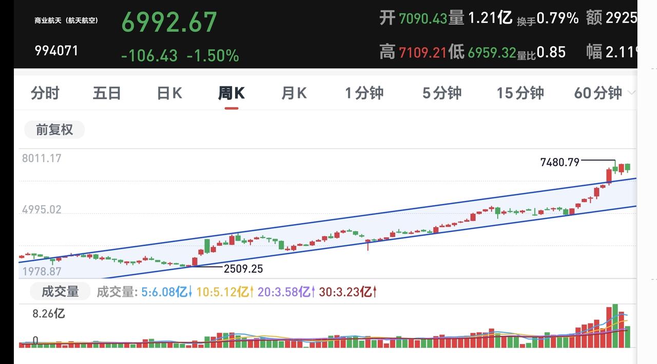 基金:商业航天板块究竟应该怎么办 欧洲市场现在下跌中,德国下跌了0.23%,英国下跌了0.50%,法国下跌了1.01%。 香港市场今天是上涨,恒生指数上涨了2.58%,国企指数上涨了2.89%,恒生科技指数上涨了2.53%,上涨幅度都在2%以上。 图3是今天基金的加仓排行榜,图4是今天基金的减仓排行榜,图5是今天基金的持有人数飙升榜,图6是今天基金的加仓人数和减仓人数,今天加仓3576937人,今天减仓1039324人,今天加仓人数超过了减仓人数。 持有的基金净值绝大部分已经更新,上涨幅度最大的三个板块是:芯片半导体板块,兴全合宜,上证50板块,下跌幅度最大的三个板块是:主控核聚变板块,军工板块,AI应用板块,净值整体上涨了1392元。 今天下跌幅度最大的四个板块是:机器人板块,脑机器口板块,光伏板块,商业航天板块,商业航天板块下跌了1.58%,持有人数在所有板块当中排名第五位。 看下面的截图13,这是商业航天板块周K线图,现在的位置处于这个上涨通道的上方,最近的3周就是在横盘震荡中,是高位的横盘震荡,耐心等待这个板块方向的选择,持有的人,现在当然是继续持有,想进场的人,现在肯定是需要谨慎。 花一秒钟点赞,花30秒钟评论,点赞和评论是对我最大的支持,谢谢大家的评论,点赞,转发和分享。