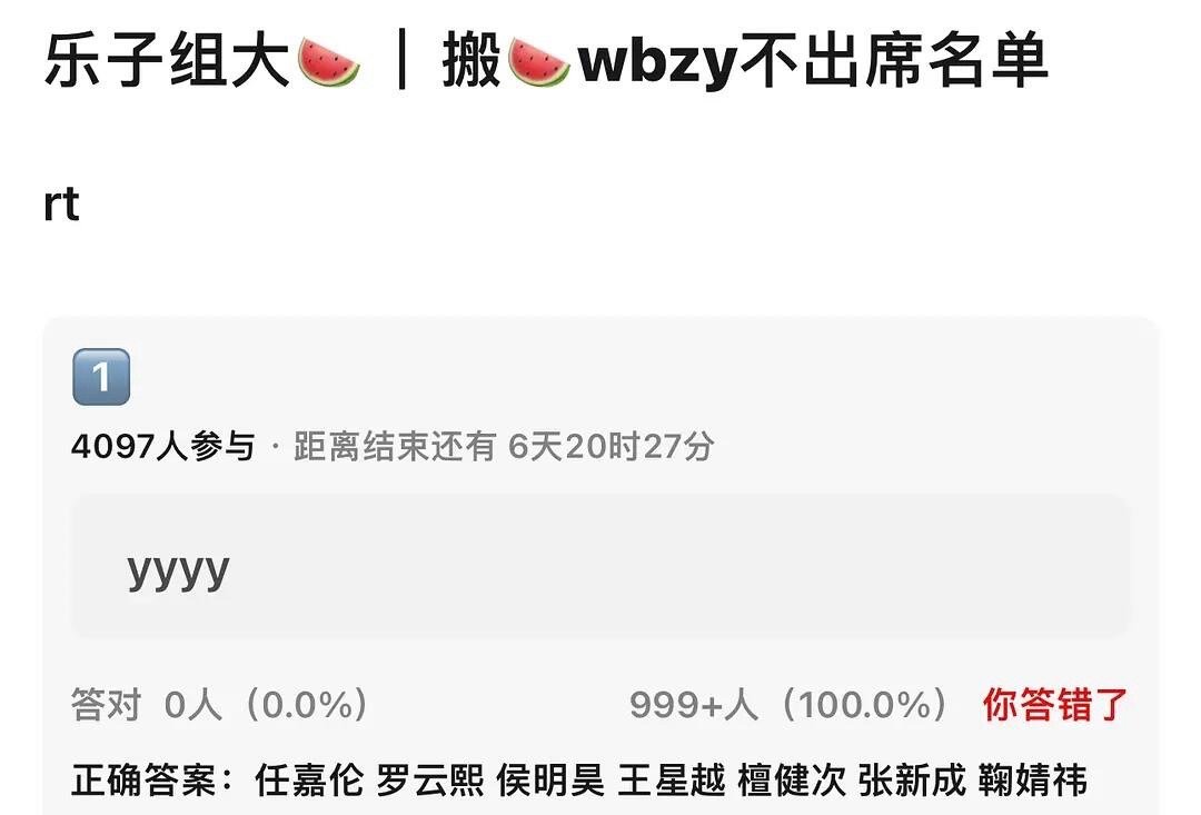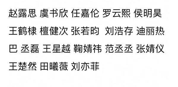 wbzy流量大的好像没几个去的|||确认不去的:迪丽热巴、刘亦菲、王鹤棣、张婧仪、田曦薇、鞠婧祎、刘浩存、王楚然、范丞丞、任嘉伦、张新成、檀健次、罗云熙、梓渝、田栩宁、侯明昊、王星越、徐若晗、赵丽颖、赵露思、虞书欣、张若昀、丞磊待确认(等进一步消息):唐嫣、刘诗诗wb终究是没落了看来今年没什么看点了