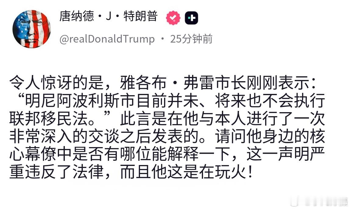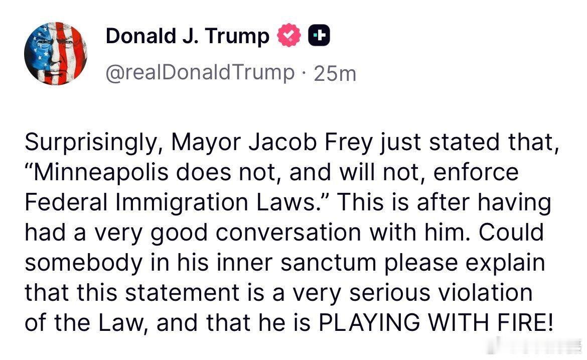 特朗普今晚发帖警告明尼阿波利斯市长雅各布·弗雷,该市拒绝执行联邦移民法,此举“无异于玩火”。补充问一句:陆军第11空降师做好准备了吗?海外新鲜事黄媒不会说的真相