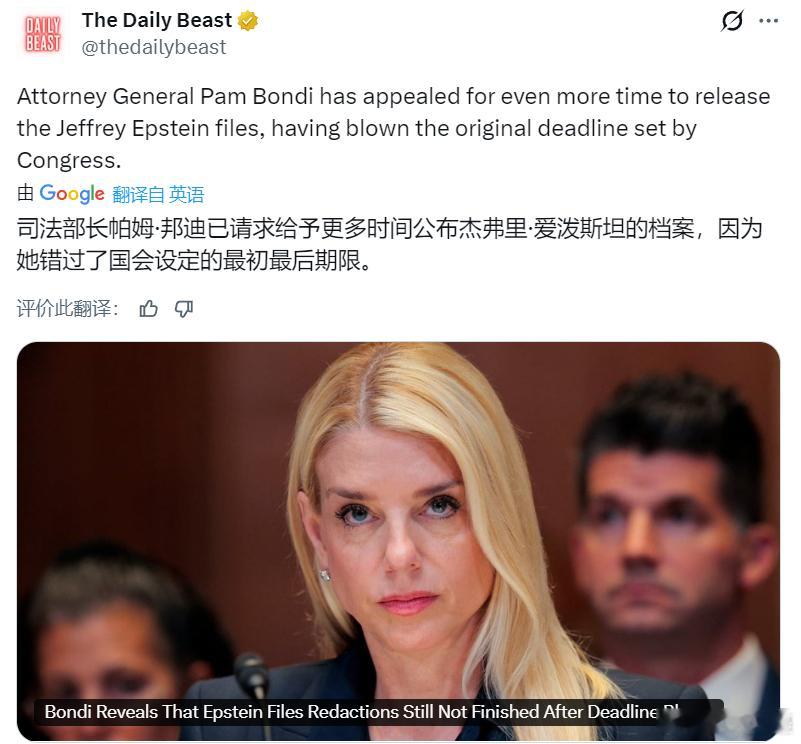 ICE枪杀事情还在发酵,新的问题又来了.......美媒:司法部长帕姆·邦迪已请求给予更多时间公布杰弗里·爱泼斯坦的档案,因为她已经超出了国会设定的最初期限。邦迪现在表示,美国公众还需要等待更长的时间。部门领导在周二提交的一份法庭文件中称,他们预计新的版本“将在短期内发布”,但无法给出具体日期。尽管已经远远超过了12月19日的截止日期,但似乎是为逃避责任而编造的借口。海外新鲜事黄媒不会说的真相