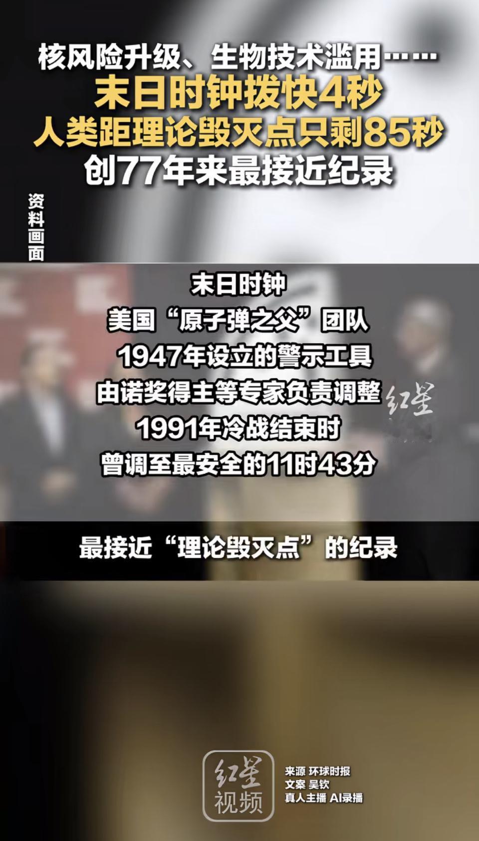 核风险升级,“末日时钟”又被拨快4秒,人类距理论毁灭点只剩85秒,这可不是闹着玩的。《原子科学家公报》指出,核大国的强势、核军控体系瓦解、俄乌冲突等,都让全球灾难风险直线上升。 过去4年里科学家已三次将时钟调近午夜,去年还是89秒,今年就更紧迫了。特朗普执政时削减环境等科学机构的人员和预算,也加剧了风险。现在长期外交框架承压,核试验威胁重现,三场军事冲突都笼罩在核武器阴影下。每一秒都很关键,人类真得好好反思,赶紧行动起来,不然真的危险了。 假如核战来临 核战毁灭 末日算法 核灾难 核灾难避险 末日时钟 末日警钟