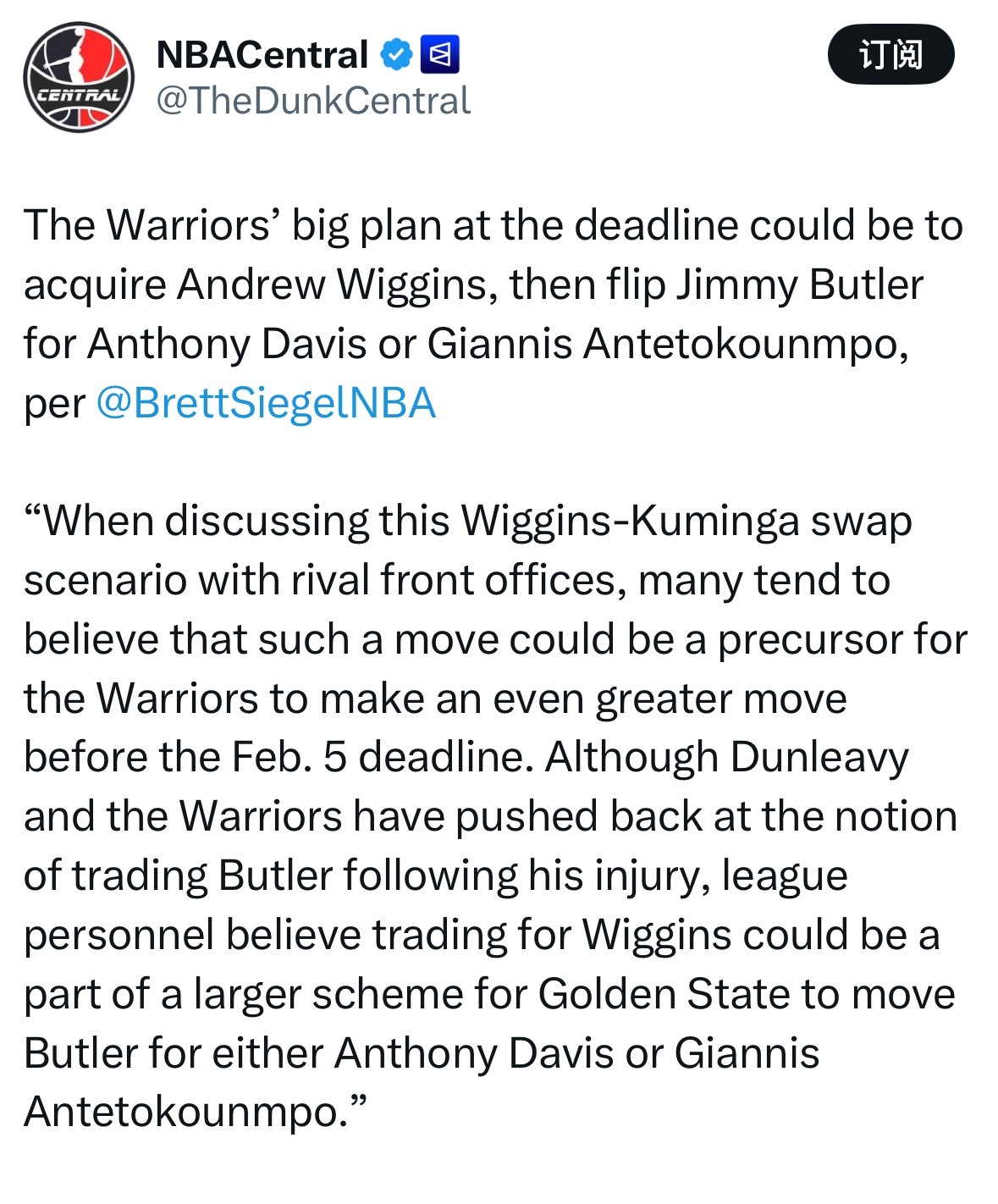 Brett Siegel:勇士在交易截止日前的宏伟计划,可能是先引进维金斯,再将巴特勒作为筹码,去换取戴维斯或字母哥。“在与其他球队管理层讨论维金斯与库明加互换的方案时,不少人认为这笔操作可能是勇士在2月5日截止日前,酝酿更大手笔交易的前兆。尽管巴特勒受伤后,邓利维和勇士方面已经否认了交易他的传闻,但联盟业内人士普遍认为,引进维金斯或许是勇士整体布局的一部分——他们最终可能会送走巴特勒,去换取安东尼·戴维斯或是扬尼斯·阿德托昆博。