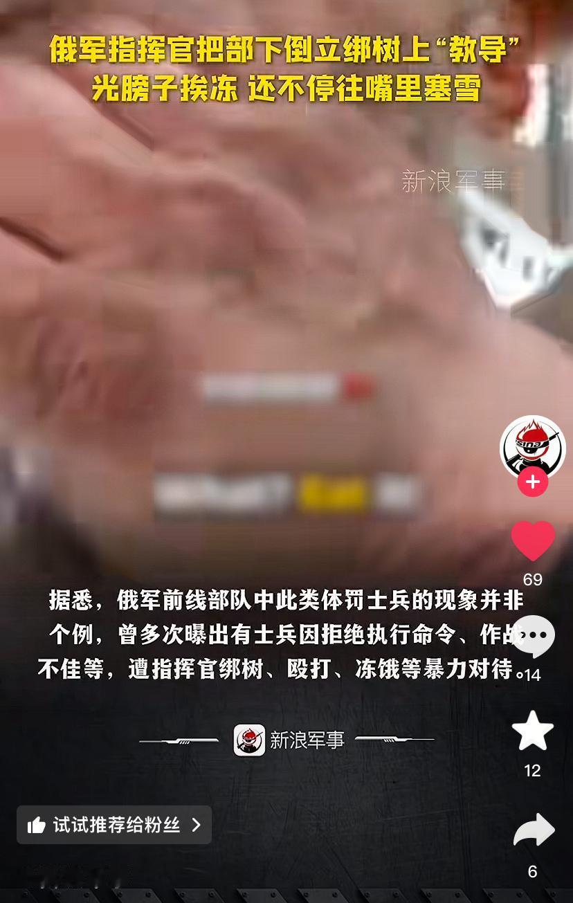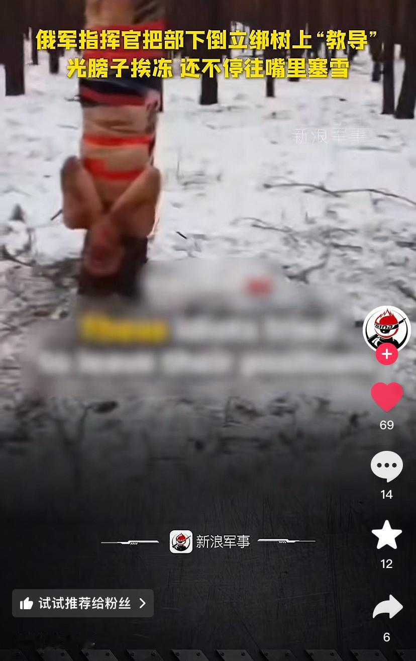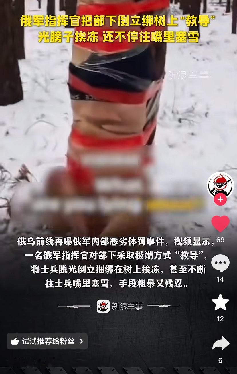 俄军军官在冰天雪地里将一名士兵扒光上身倒绑在树上,并不停往其嘴里塞雪进行体罚,手段残忍。这一幕被同伴拍下发到了网络上,新浪军事官方账号转载了这则报道。 报道称俄军基层军官使用粗暴方式“教导”不听话乃至是战场表现不佳的士兵并不是个例,在前线经常出现。体罚还只是小事,有些基层军官甚至还屡屡不切实际的逼迫士兵强行冲锋,根本不顾士兵的生死,这也是俄军伤亡巨大的重要原因之一。在之前就有过“风暴Z”幸存士兵发视频控诉指挥官的非人道处理方式,在网上向克宫告御状的事情发生。 这种状况之所以在俄军中屡见不鲜也是有原因的,一来是由于前线压力大,基层军官往往比较粗暴。二来是管理粗暴也是俄军的传统,从沙俄时代起,沙俄军队就以野蛮粗暴出名。三来是俄军历来只重结果不重视伤亡的传统,也让基层军官很难善待士兵。 只是不知道这些士兵抱着保家卫国的心态来到前线出生入死,却惨遭自己的指挥官如此对待,他们会怎么想?