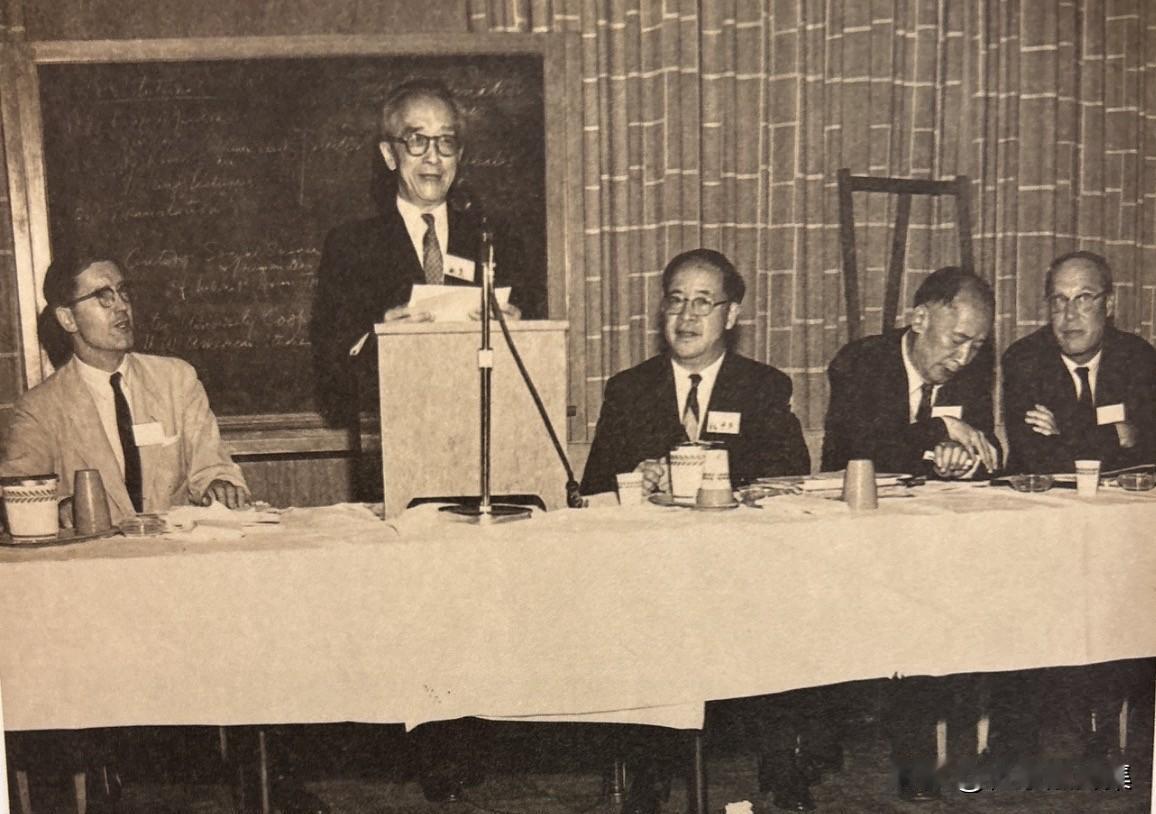 1960年7月10日,胡适在美国西雅图华盛顿大学举行的“中美学术合作会议”开幕式上演讲,讲题为“中国的传统与将来”。右二李济,作为中国现代考古学的奠基人,他的田野发掘(如殷墟)正是胡适在演讲中提到的“上古文明证据”的直接提供者。胡适强调要用“历史的眼光”看传统,这与李济用科学考古重构上古史的努力不谋而合。