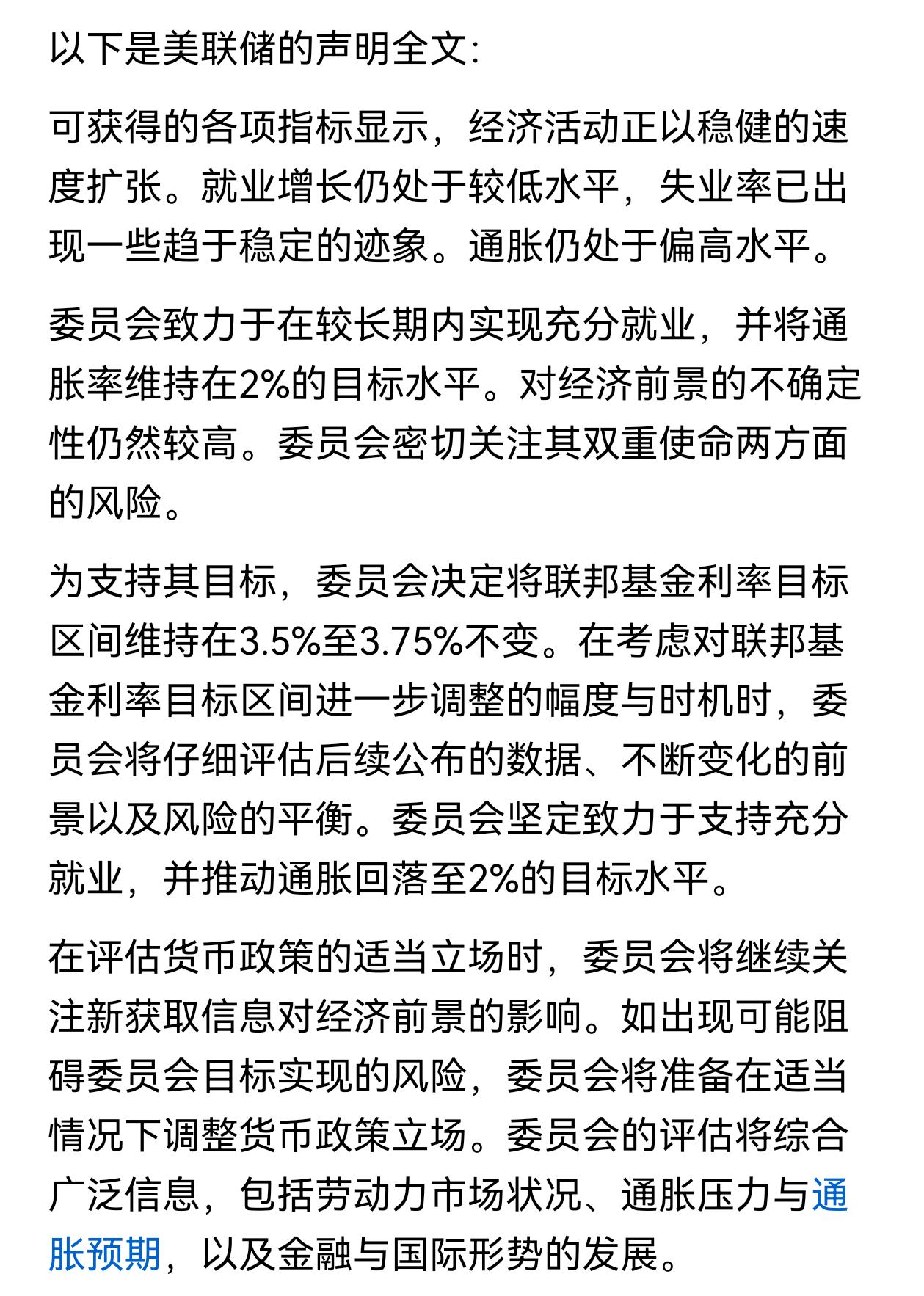 美联储宣布:不降息! 黄金和白银这是要疯了?!美联储主席鲍威尔没按特朗普要求降息,反而为了将美国的通胀维持在2%左右,并实现维持长期的充分就业,把基金利率目标维持在3.5-3.75%左右!特朗普估计得气炸了,怪不得要把鲍威尔这家伙搞下来,算上之前第一任时的背刺,现在鲍威尔这波明显继续跟特朗普对着干,特朗普前两天已经宣布找到了美联储主席适合的人选了。 接下去,美联储就得承受特朗普的怒火了,这家伙这次的手段可不是第一任时能比的,坐看好戏!