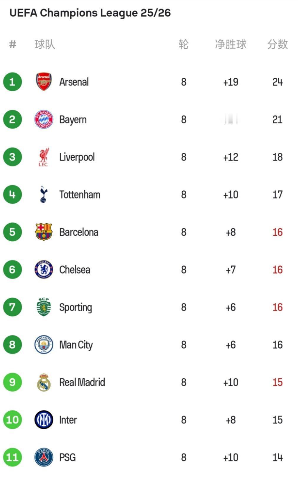 欧冠前八英超5队,不愧第一联赛!在欧冠8轮小组赛战罢之后,直通淘汰赛的前八名有5个英超队。英超第14的热刺,甚至排名第四。纽卡在最后一轮逼平巴黎,也拿到了第11名。英超终究还是当今的世界第一联赛啊,整体实力高出一档,但三四月份,联赛内耗会不会影响欧战呢,还要继续观察。