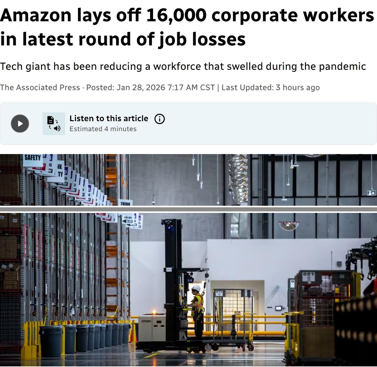 电商巨头亚马逊再次裁员16,000名员工 去年十月份刚刚宣布裁员14,000人不到三个月,亚马逊再次宣布正在裁员约16,000个企业岗位。 亚马逊高级副总裁贝丝·加莱蒂周三在博客中表示,公司一直在“减少层级,增加所有权,消除官僚主义”。 公司未透露哪些业务部门将受到影响,也未说明裁员将发生在哪个地区。 贝丝·加莱蒂表示,美国当地员工将有90天时间在内部寻找新职位,那些未能成功或不想在内部换工作的人将获得遣散费、安置服务和健康保险福利。