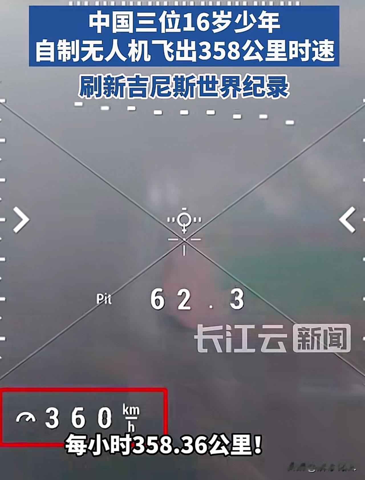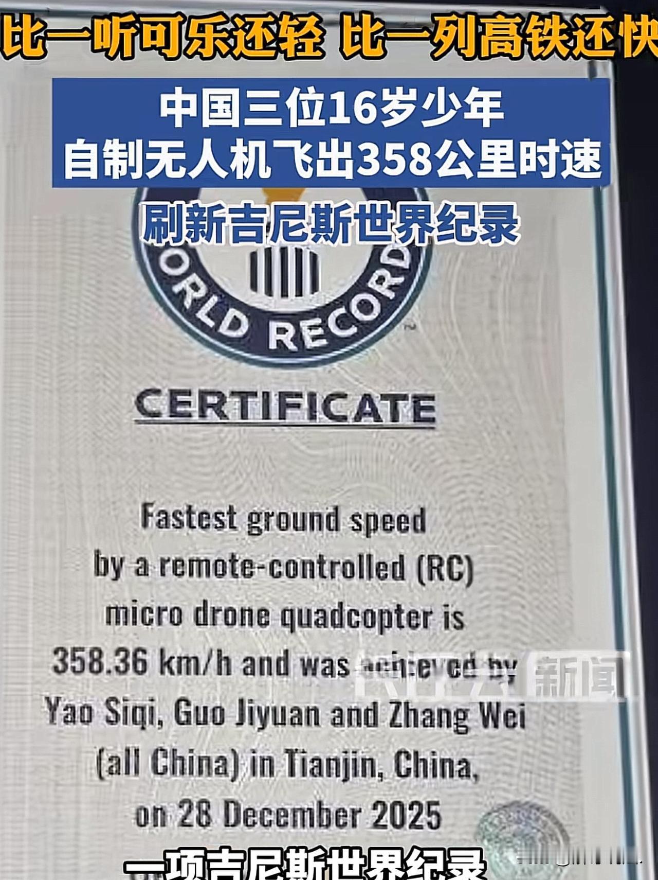 “少年强则国强!”天津,三位16岁中学生,他们利用课余时间,做出微型无人机。惊叹的是,无人机飞起来时速能到358.36公里,比大多数高铁还快,无人机净重还不到250克,比一听可乐还轻,这操作简直颠覆想象!直接把吉尼斯世界纪录给刷新了! 半年前,姚思齐、郭继元、张威三人中学生看到大三学长创下340.78公里/小时的微型无人机极速纪录,心里就冒出个大胆想法:“咱们高中生,说不定也能做到,还能飞得更快!” 说干就干,三人迅速组队,分工明确得很,姚思齐负责整机结构和气动设计,郭继元管飞行控制和操作,张威专门做数据分析和飞行执行,朝着“遥控微型四轴飞行器最快地面速度”的吉尼斯纪录发起冲击。 可挑战哪有那么容易? 核心难题就摆在那:无人机重量必须控制在250克以内,还得飞出超高速,这简直是在“螺蛳壳里做道场”。 他们的第一架原型机,刚首飞就直接“炸机”,半个月的心血全成了碎片;后面几次测试更惊险,无人机飞到接近300公里/小时时,还发生过高速解体、头罩脱落的意外,每次都得从头再来。 但这仨少年根本没泄气,每次失败后都抱着残骸翻数据、找问题,硬是靠着“用测试结果说话”的韧劲,一步步优化设计。 为了在极致限重下释放最大动力,他们可下了不少功夫。没有盲目跟风用轻量碳纤维,反而选了强度更高的钛合金做电机支架,再用精巧的结构设计省去多余支撑,硬生生省出20克重量全用在动力系统上;机身外壳反复打磨抛光,就是为了减少风阻,连电池都得提前预热,才能激发最大潜能。 前前后后经历了六次完整迭代,每一个细节都抠到极致,终于让无人机的性能越来越稳定。 去年12月底,挑战正式开始。那天天气特别给力,几乎没风,就是温度有点低影响电池活性,好在团队早有准备,提前预热电池弥补了这个问题。 当郭继元全油门操控无人机冲过测速区间时,所有人都捏着一把汗,结果出来的瞬间直接沸腾,358.36公里/小时!不仅远超之前的纪录,甚至比事前预测的误差还控制在±5公里/小时以内,吉尼斯认证官当场就给他们颁发了证书。 更让人佩服的是,这三位少年赢了之后一点不藏私,直接把整套设计方案在GitHub上开源分享了。 他们说,当初挑战时,前任纪录保持者徐阳也无私分享过关键资料,现在他们也要把这份传承延续下去,希望能激励更多爱好者一起探索。 姚思齐说自己学会了“工程取舍”,郭继元摸清了高速飞行的操控逻辑,张威则更加坚信“高中生也能完成世界级工程目标”。 想想看,16岁的年纪,不是沉迷游戏,而是抱着对科学的热爱,在实验室里一遍遍打磨作品,经历失败不放弃,成功后还想着分享传承。 这场“中国极速接力”,不仅刷新了世界纪录,更让我们看到了青春该有的样子! 敢想敢干、精益求精,还带着一份开放包容的格局。 期待未来能有更多这样的少年,在自己热爱的领域发光发热,创造出更多惊喜!