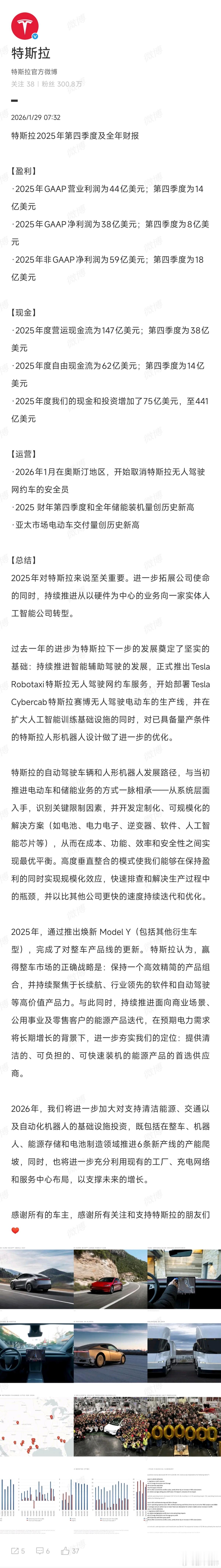 特斯拉2025年第四季度财报+全年财报。主要看一下盈利情况:-2025年GAAP营业利润为44亿美元,净利润38亿美元,非GAAP净利润59亿。-2025年GAAP第四季度营业利润14亿美元,净利润8亿美元,非GAAP净利润18亿美元。Tips:让豆包总结了一下GAAP。GAAP盈利:法定披露口径,必须严格按「美国通用会计准则」编制,包含所有符合准则的收支,结果具可比性与审计要求。 相对大笔开支的「股票激励」也算在GAAP盈利中。非GAAP盈利:公司补充口径,剔除与核心经营无关的项目,用于向投资者展示 主营业务真实盈利能力, 不具法定强制力。新能源汽车撩妹不如撩车 特斯拉发布2025全年财报