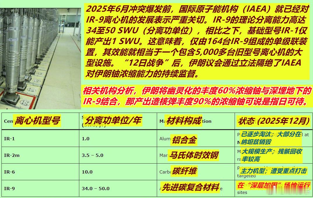 图1:看到今天ABC的这则报道,想到昨天国内媒体铺天盖地的美国要打伊朗的分析,基本是枪长炮短的“大妈军事”式分析,很少关注特朗普为为啥要逼伊朗签新版核协议?图2:我以伊朗可能遭打击前就已转移了的IR-9离心机为例做了个图示说明一下——简单说,只要伊朗用1000台IR-9在深埋地下的非标识工业区(面积不超过2个篮球场),对同样被转移的丰度60%的浓缩铀进一步浓缩,那距离造出核弹就指日可待了。值得注意的是,伊朗现政权只字不提这张“牌”,而伊朗激进强硬派则一直逼政府马上就学朝鲜,立即造出核弹。