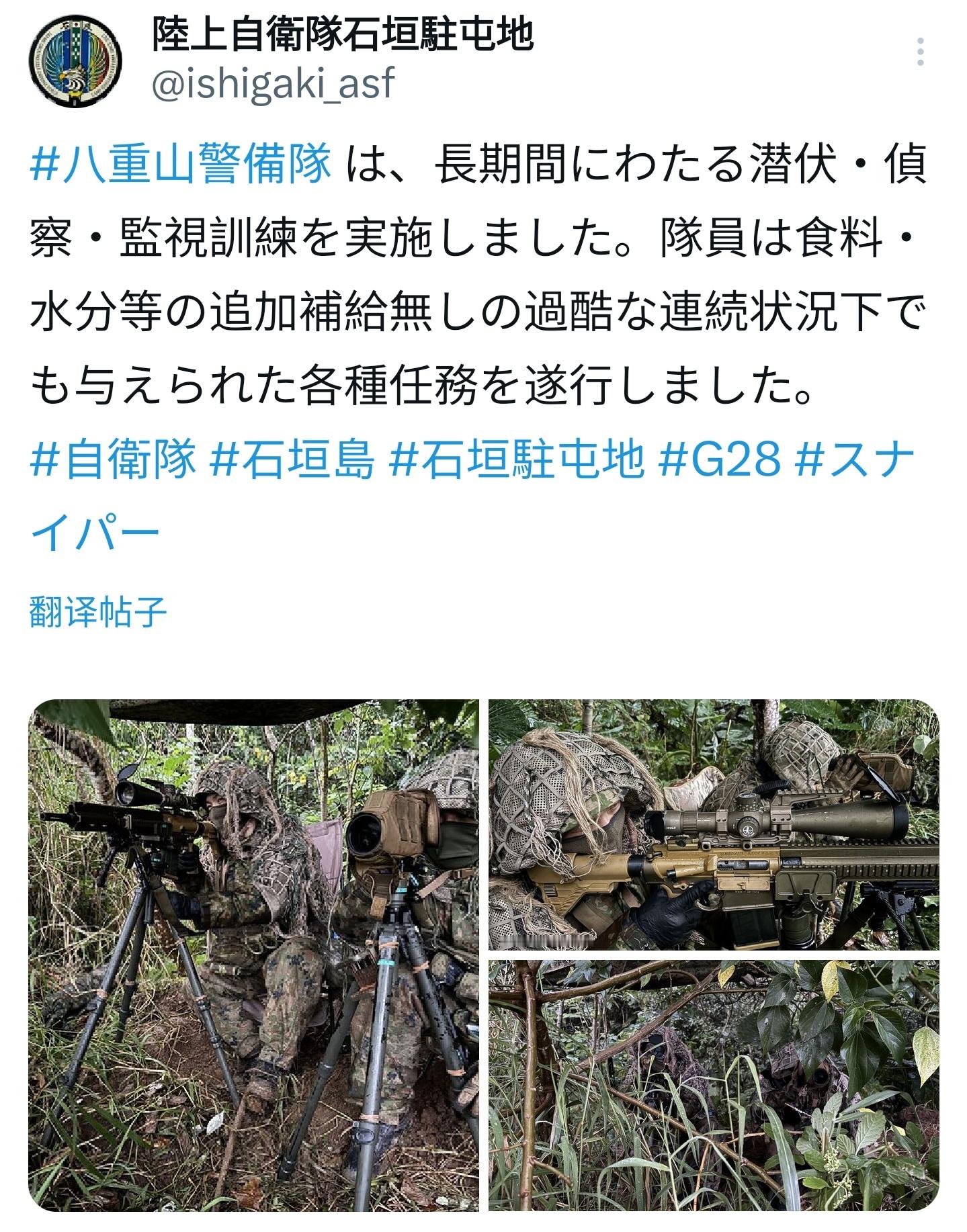 驻扎在琉球石垣岛的日本陆上自卫队“八重山警备队”列装的德国G28精确射手步枪(即HK为德国联邦国防军定制的HK417版本),该枪配备Leupold Mark 5HD 5-25x56型光学瞄准镜。烽火问鼎计划每天认识一件兵器 八重山警备队属于日本陆上自卫队的普通科(步兵)部队,担负岛屿警备和防卫作战等任务。它是根据日本加强 南西方面防卫战略的一环成立的,旨在执行针对中国台湾、钓鱼岛方向的作战行动。