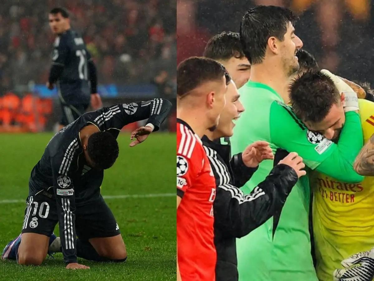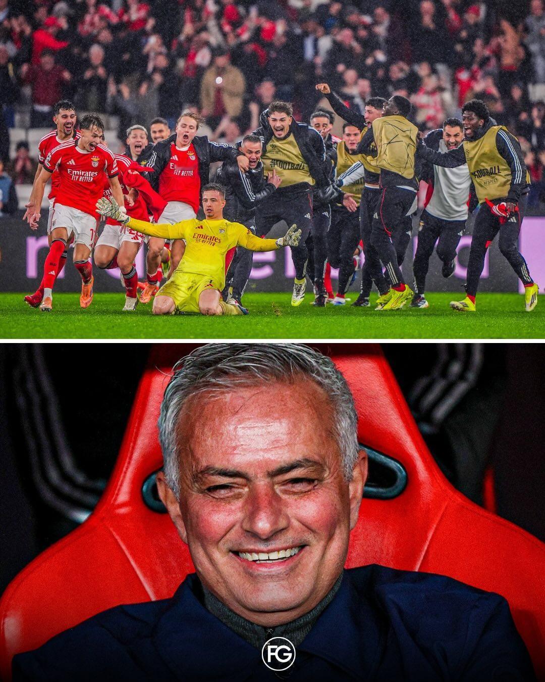 库尔图瓦恭喜绝杀自己的本菲卡门将!识英雄重英雄,本菲卡门将特鲁宾补时的头球破门,帮助本菲卡打进了欧冠附加赛,也将皇马拖入了附加赛。届时,两队还有可能继续在附加赛中相遇。 穆里尼奥完成了几乎不可能完成的任务,将本菲卡带到了晋级。赛后,被破门的皇马门将库尔图瓦,也向特鲁宾表示了敬意。