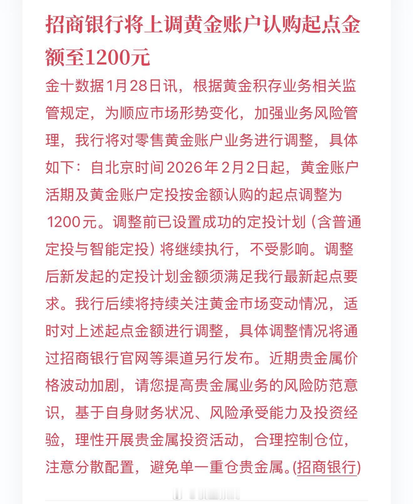 招商银行上调黄金账户认购起点金额💰自2026年2月2日起,黄金账户活期及定投认购起点积分1000元上调至1200元