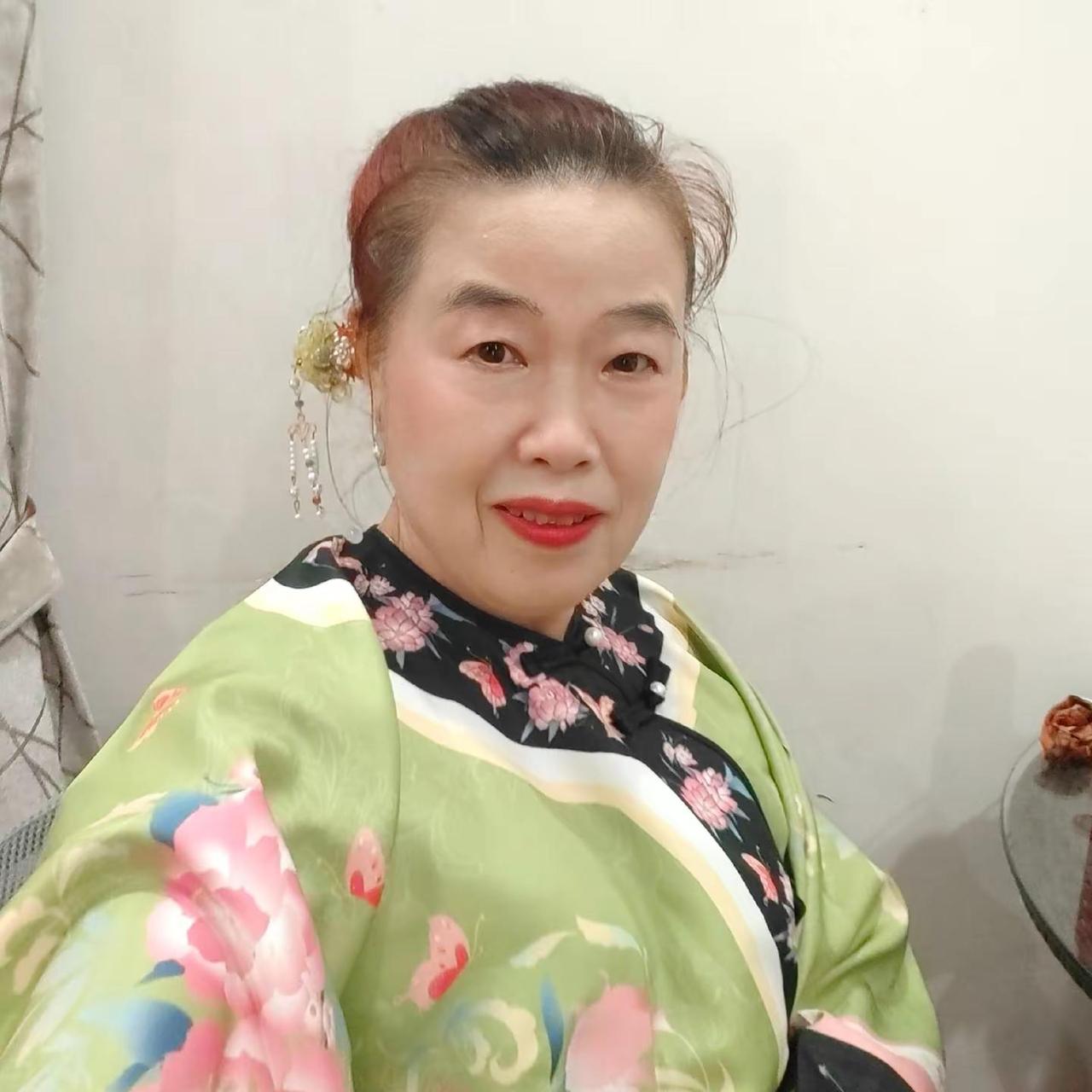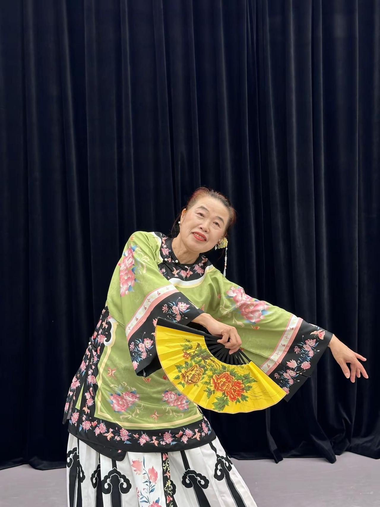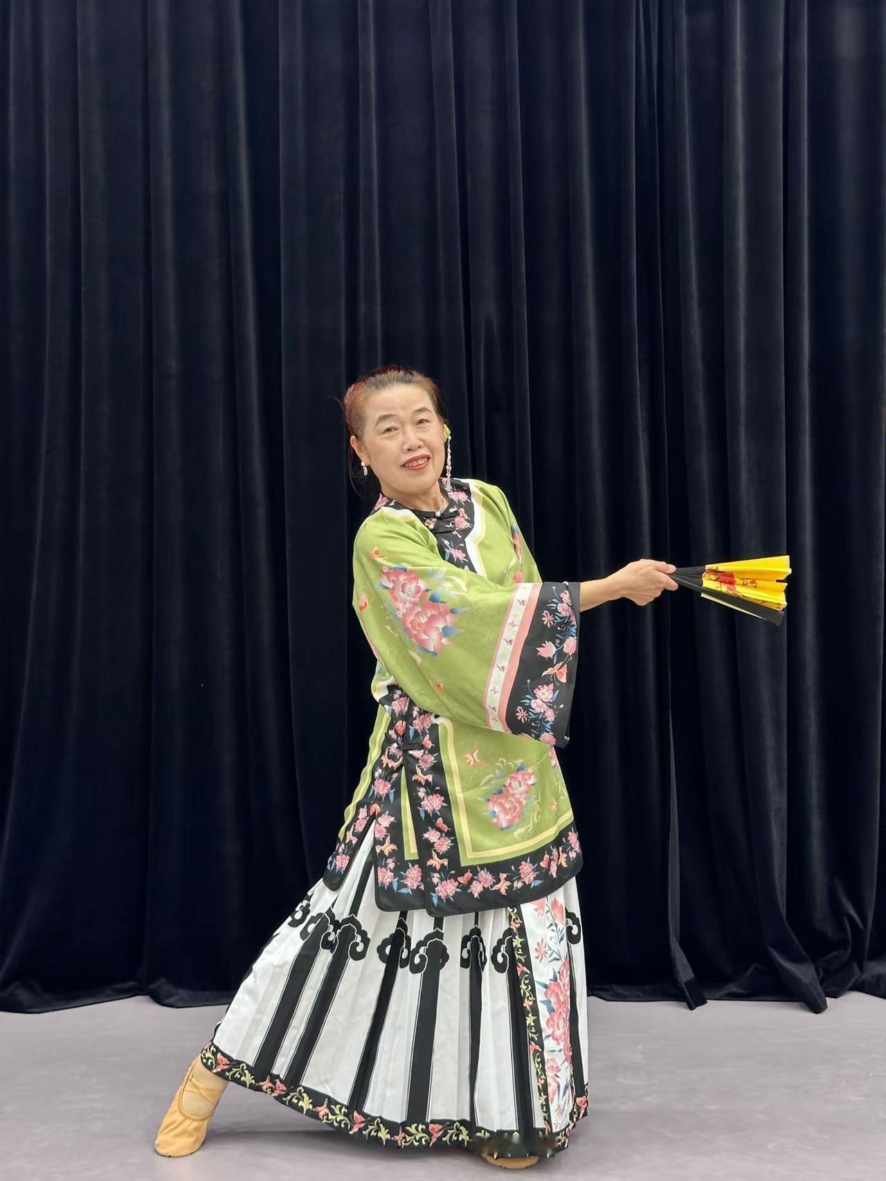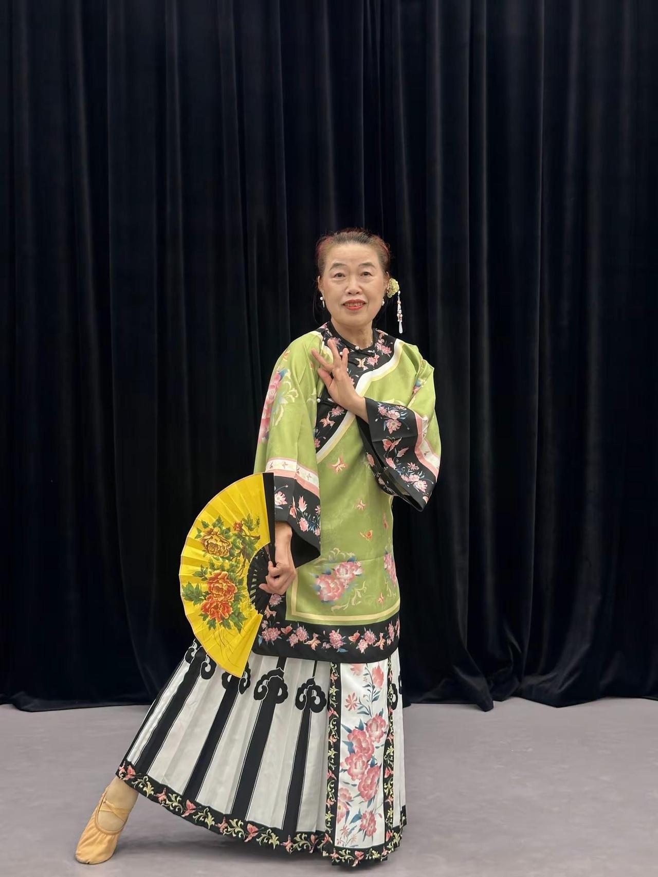 墨绿裙间花意柔素净的背景里,她立在轻光中,像把春日花簇织进了墨绿的柔缎里。