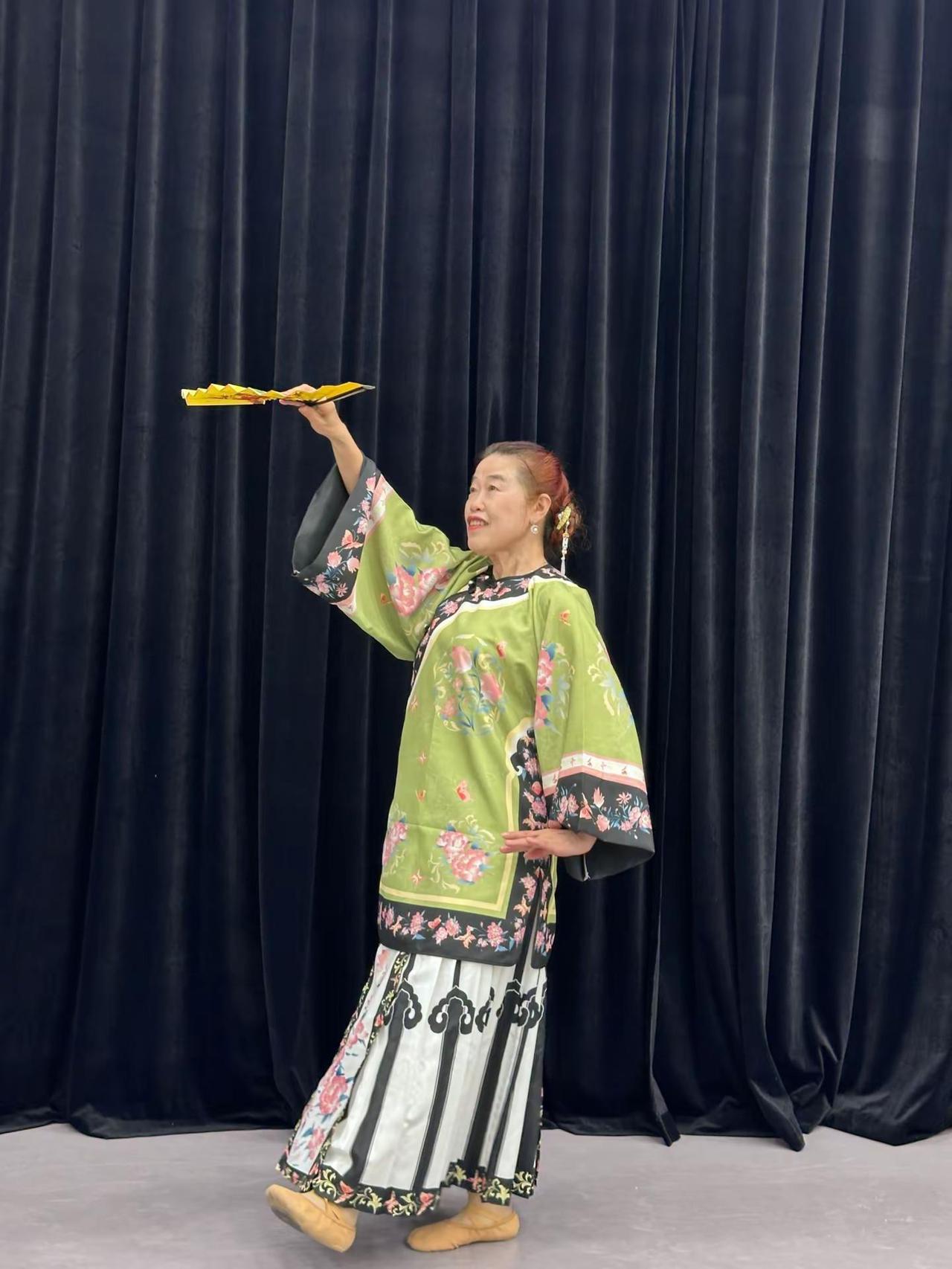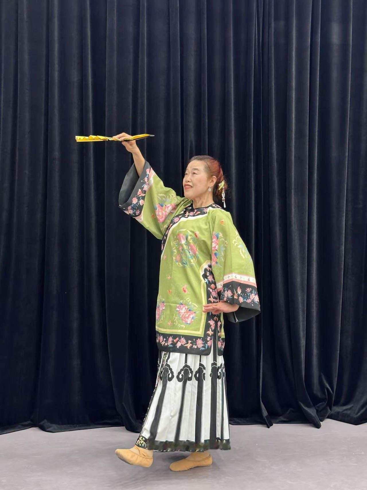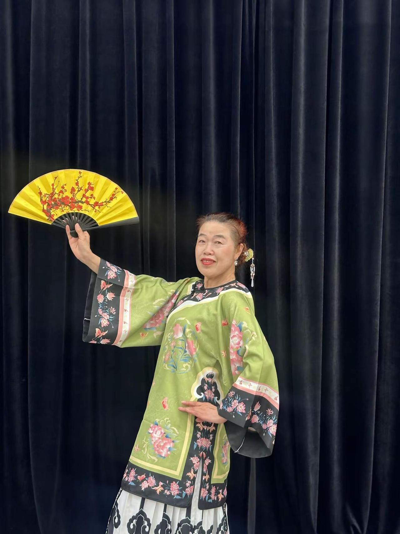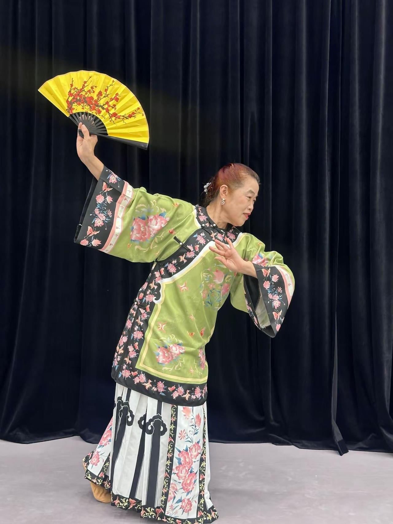 墨绿裙间花意柔素净的背景里,她立在轻光中,像把春日花簇织进了墨绿的柔缎里。