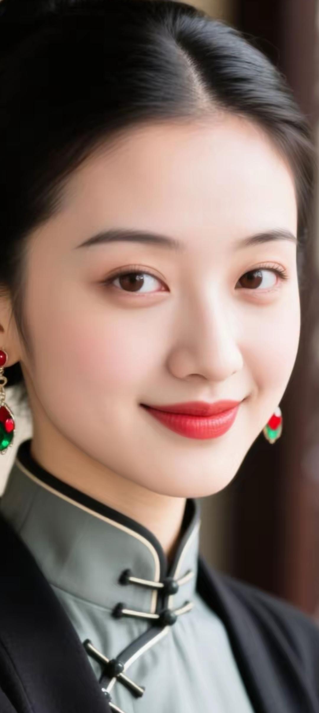 古典优雅,红唇绿耳坠,尽显东方韵味