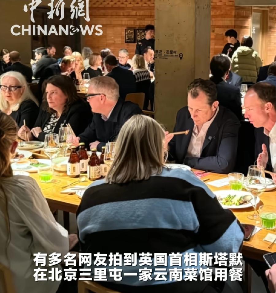 斯塔默在三里屯吃云南菜,上次美国财长耶伦也来过这家店,一是距离美、英大使馆近,10分钟车程,二是有中国特色、饭馆装修精致、菜品蔬菌健康美味,三是美英文化一家,趣味品味相近! 斯塔默与大使馆老乡工作人员,去了一群人,摆了几桌,看摆桌形式,长条桌西方餐饮习惯,不过大家用筷子用得很顺溜,斯塔默第一次到中国来,不知道之前是否在英国本地吃过中餐,使用筷子怎么样!英国是美食荒漠,相信中国菜一定能让斯塔默大开眼界、赞不绝口!