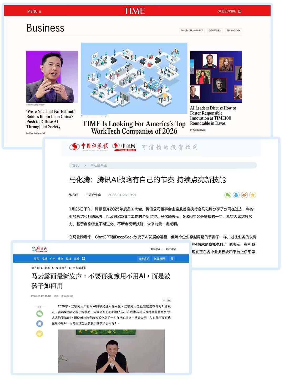【BAT创始人赛博再聚首,畅谈AI行业的全新机遇!】 这几天,BAT三巨头的创始人罕见地集体就AI发声,提出了各自对AI发展的独特看法,就像给行业开了一场“圆桌派”。 百度李彦宏忙说AI的最大机会在应用层,马化腾强调腾讯AI“稳扎稳打”,马云则把话题聚焦在教育:“别纠结用不用AI,要教孩子怎么用”。 一个个细说。李彦宏在接受国际权威媒体《时代》周刊专访时指出,AI最大机会在应用层,未来只会剩下少数几个模型,但会有大量成功的应用玩家。现在来看,几乎所有大厂都在瞄着应用去了,这也侧面印证了李彦宏的判断。马化腾则延续腾讯一贯风格,强调在原有业务节奏上点亮新技能。马云则跳出技术圈,直指AI时代的教育本质,提醒大家别光顾着追风口,忘了给下一代铺好路。 三位大佬的视角各有侧重,却又恰好构成了中国AI发展的完整切面:有技术落地的雄心,有商业深耕的沉稳,更有面向未来的思考。 在AI狂飙的2026年,这场“赛博聚首”式的发声,不仅让我们看到行业的多元路径,更让我们明白:真正的AI竞争,从来不是比谁跑得更快,而是比谁能走得更稳、想得更远。