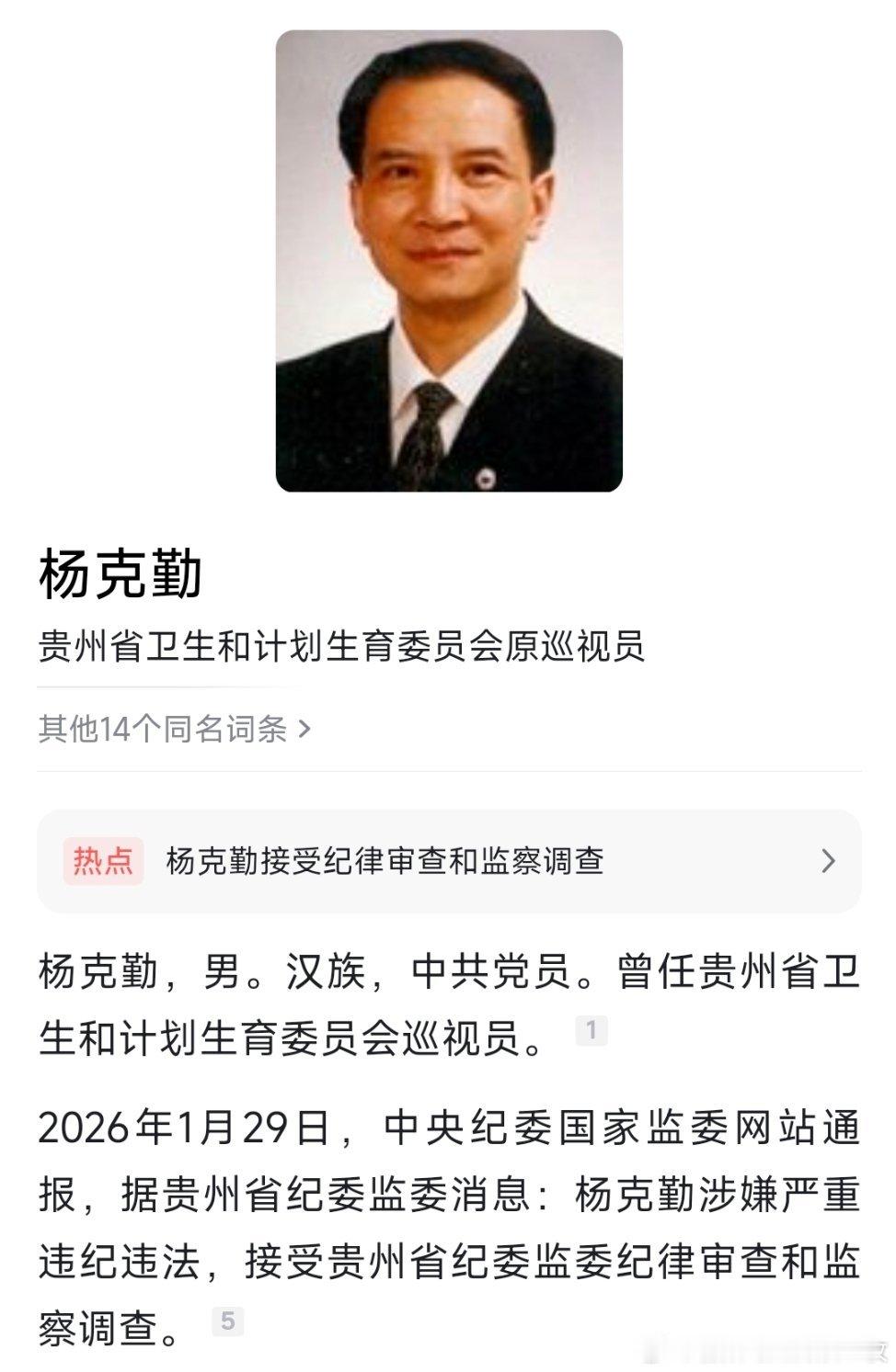 贵州省医学会会长、原贵州省卫计委巡视员杨克勤接受审查调查。