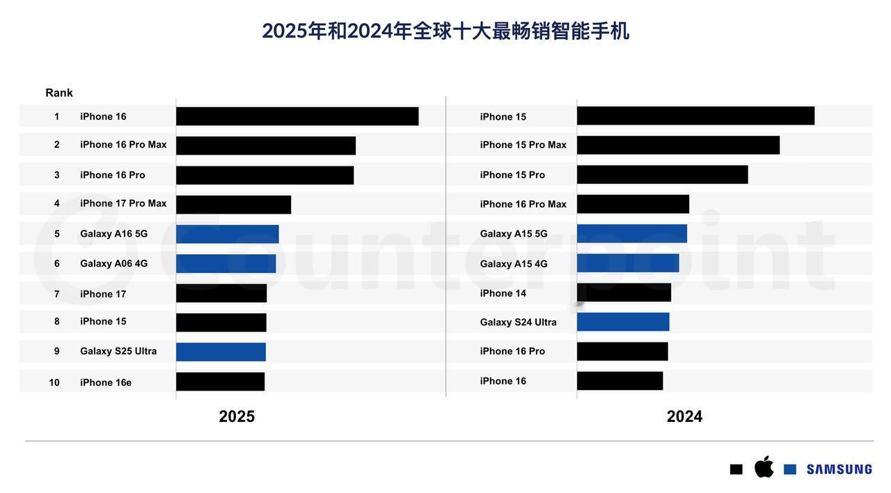 Counterpoint 发布了 2025《全球手机型号销售追踪报告》去年最畅销的手机是 iPhone 16,最畅销的 Android 手机是三星 Galaxy A16 5G。具体排名: 1、iPhone 16 2、iPhone 16 Pro Max 3、iPhone 16 Pro 4、iPhone 17 Pro Max 5、三星 Galaxy A16 5G 6、三星 Galaxy A06 4G 7、iPhone 17 8、iPhone 15 9、三星 Galaxy S25 Ultra 10、iPhone 16e 2025 国内最畅销的手机大概率也会是 iPhone 16,只好奇国内最畅销的 Android 会是哪台手机。[旺柴]