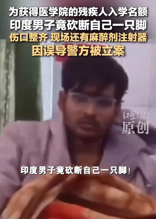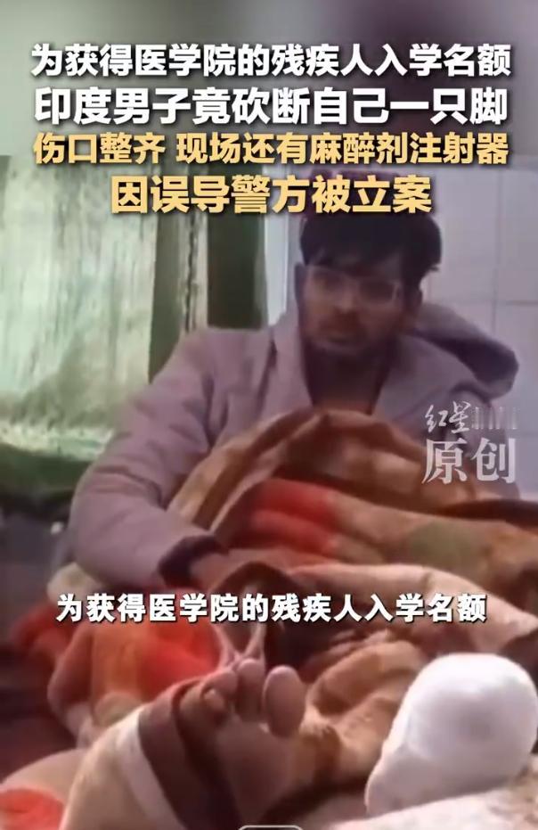 印度小伙为获残疾人入学名额自断一只脚! 狠人!印度一个20岁小伙,两次考医学院都没考上,想到和残疾人抢入学名额,狠心把自己的脚砍了,结果因为伤口切得太整齐、说辞又前后矛盾,直接被警察识破。 这医学院本来留了5%的名额给残疾人,还要求得是残疾程度40%以上、影响生活自理的那种,结果他倒好,提前打了麻醉,用机器把左脚齐刷刷锯断,还拉着亲哥一起报假案,谎称被人袭击了。 确实是很好学了,居然想到这种方式想入学,但让那些真正有残疾、等着这个名额的人怎么办呢?真搞不懂为什么能对自己这么狠,印度这奇葩事也太让人开眼了!