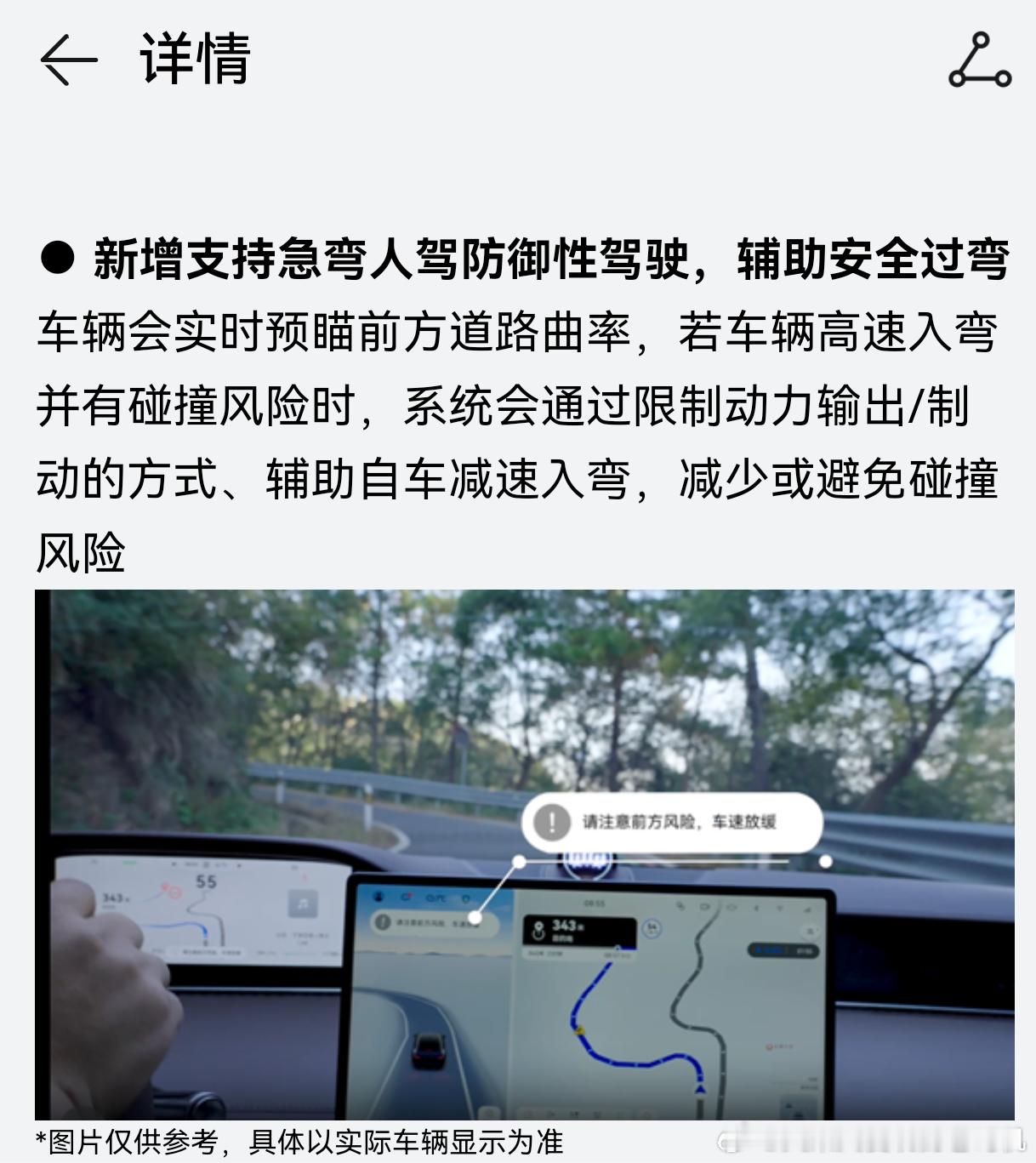 ADS4.1新增支持急弯人驾防御性驾驶,辅助安全过弯车辆会实时预瞄前方道路曲率,若车辆高速入弯并有碰撞风险时,系统会通过限制动力输出/制动的方式、辅助自车减速入弯,减少或避免碰撞风险。快被呵护成宝宝了鸿蒙智行 华为乾崑智驾