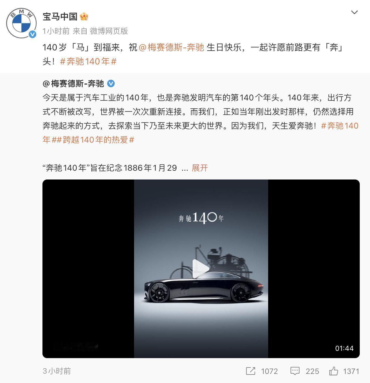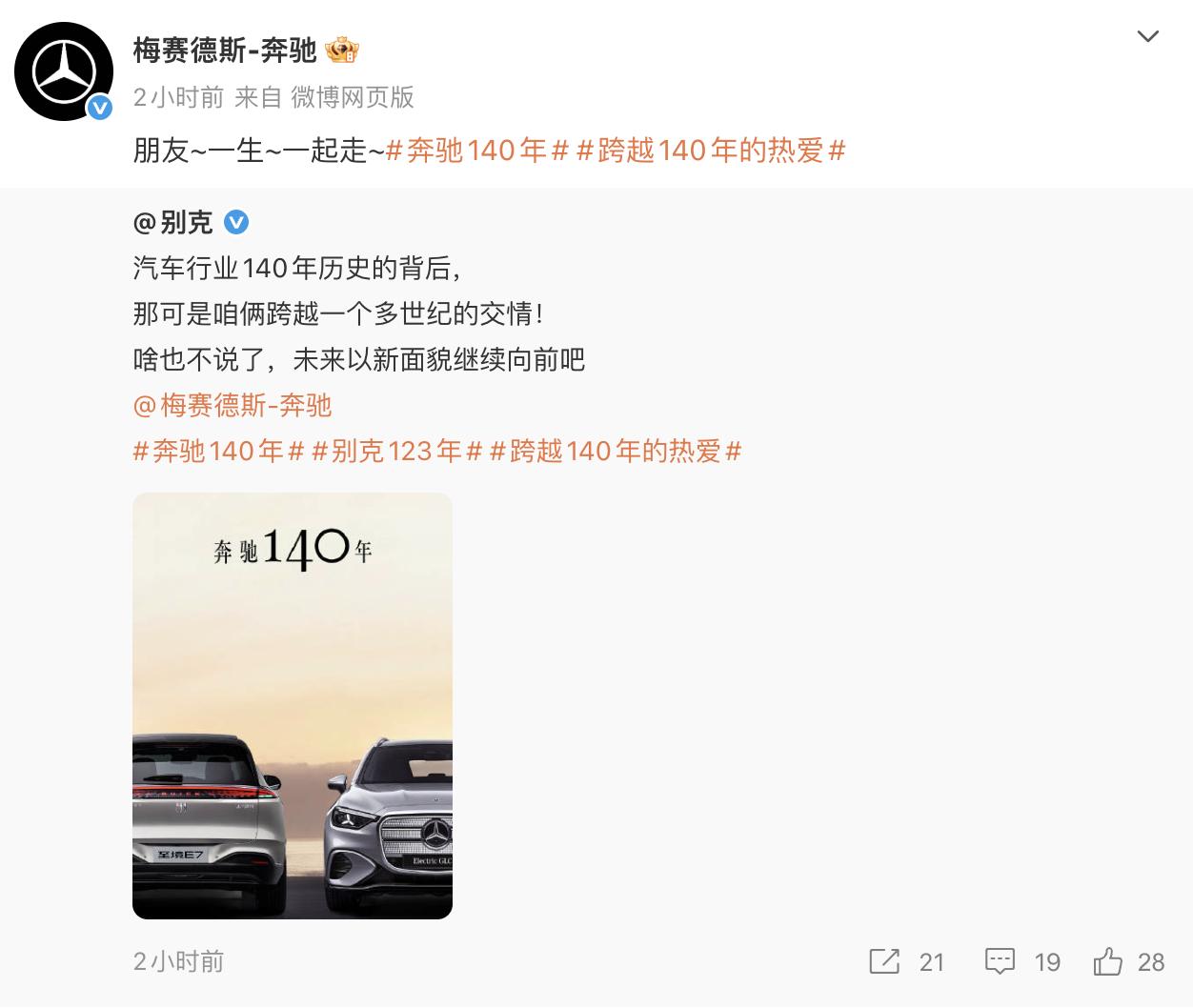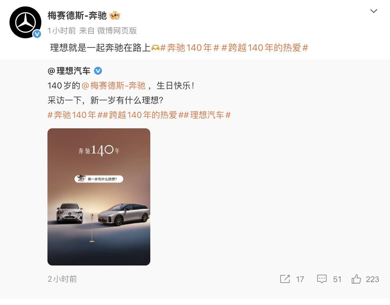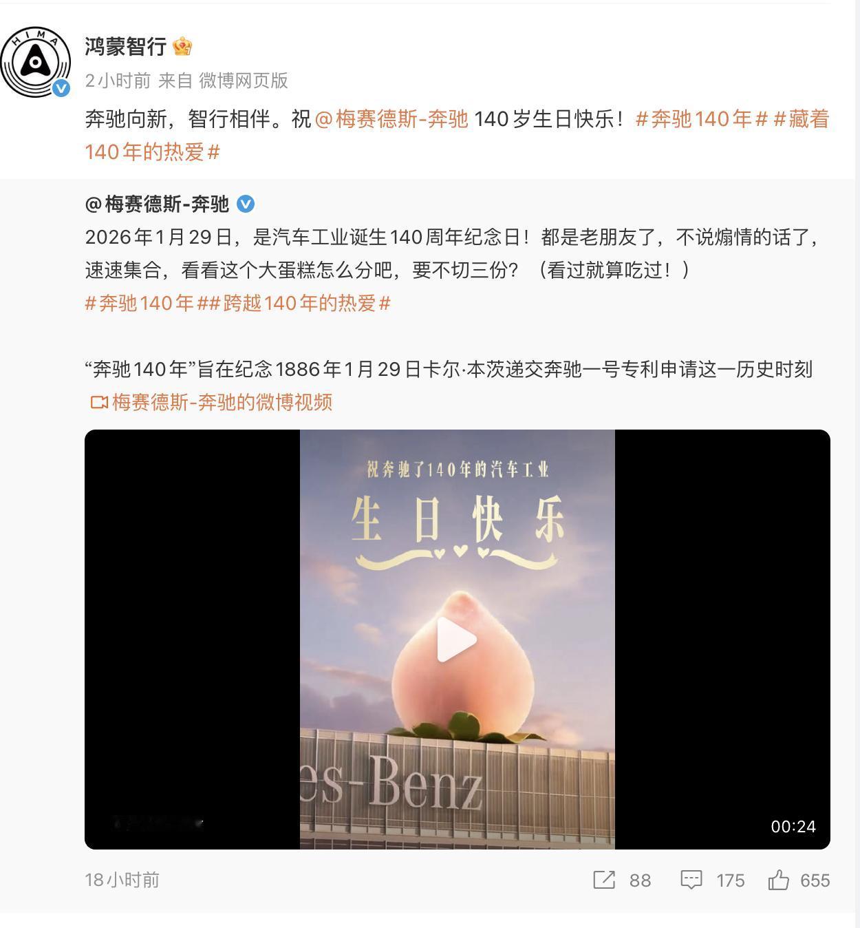 奔驰140岁生日,又到了车企集体收祝福环节(ceng re du)[奸笑]看看哪些车企给奔驰送了祝福? 新能源有小米汽车、理想汽车、鸿蒙智行等等 传统车企,有宝马、奥迪、凯迪拉克、别克、吉利、沃尔沃等等