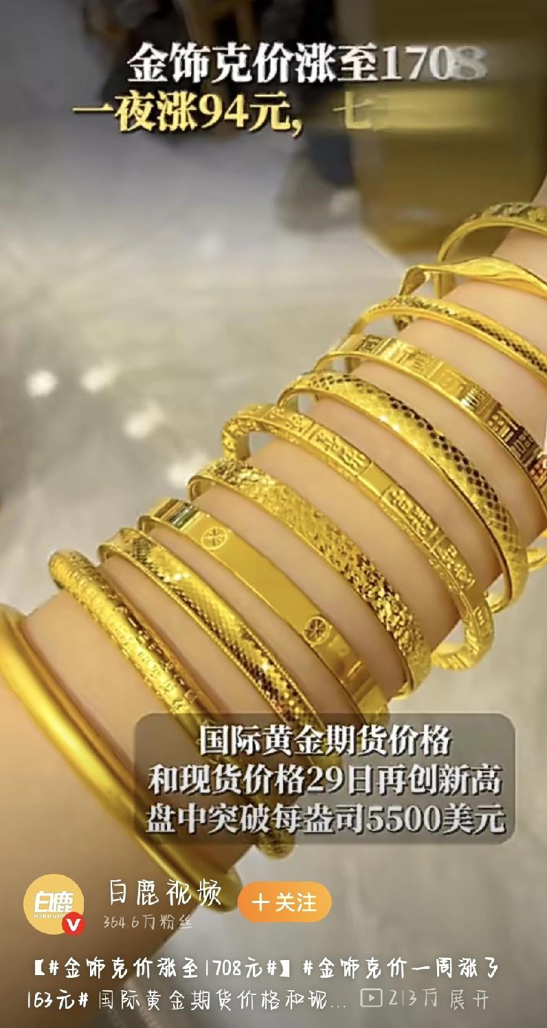 最近的黄金市场真是“杀疯了”!就在1月29号这天,行情热得简直像烧开了的水——国际黄金期货和现货价格齐刷刷创下新高,盘中一口气突破每盎司5500美元大关。你想想,从5000美元冲到5500美元,才用了三天,这速度坐火箭都追不上! 国际金价一飙,国内金店立马“跟涨”。里头最惹眼的要数周生生:1月23日它家足金报价还是1545元/克,结果短短七天,到29号就蹿到了1708元/克,整整涨了163元。更猛的是28号到29号这一夜,直接暴涨94元——什么概念?一天涨的钱都快够买小半克金子了!不仅周生生,老庙黄金、周大福这些牌子也没闲着,老庙黄金单日甚至涨了110元,不少品牌金饰每克都迈过了1700元门槛。 金价这么疯,也不是没理由。首先全球不太平,地缘冲突不断,贸易摩擦频发,大家心里都不踏实,黄金作为“压箱底”的硬通货,自然成了避险首选。再加上美国背了38万亿美元巨债,美元信用越来越让人嘀咕,美元指数又跌到近四年最低,很多人就更愿意换黄金来保值。还有各国央行也在拼命“囤货”,我国央行已经连续14个月增持黄金,全球央行去年的购金量更是破了纪录——有这么多“大买家”撑场子,金价想不涨都难。 市场反应也特别有意思,完美上演了“买涨不买跌”。郑州有金店3小时卖出120万元金条,胖东来的黄金柜台被挤得水泄不通,热门规格的金条直接断货。不过也有不少人心里打鼓:价格涨成这样,将近一半的顾客都犹豫了,有些门店销量比上月降了快两成。反倒是一口价金饰越来越受欢迎,因为设计好看、价格相对稳定,很多人觉得现在买这种更划算,各大品牌也在悄悄加大这类产品的比例。 投行们也纷纷唱多金价,高盛说今年春天金价或许能冲上6000美元/盎司,德意志银行、美国银行也给出了类似的乐观预测。不过也有分析师提醒:短期涨得太凶,说不定会有回调,投资还是要多留个心眼。对咱们普通人来说,如果是刚需买首饰,现在这价格确实肉疼;但如果想投资,千万别盲目跟风,得多掂量掂量风险。毕竟黄金再火,追高也容易站岗,保持清醒、理性看待,才是最靠谱的。 来源:白鹿视频