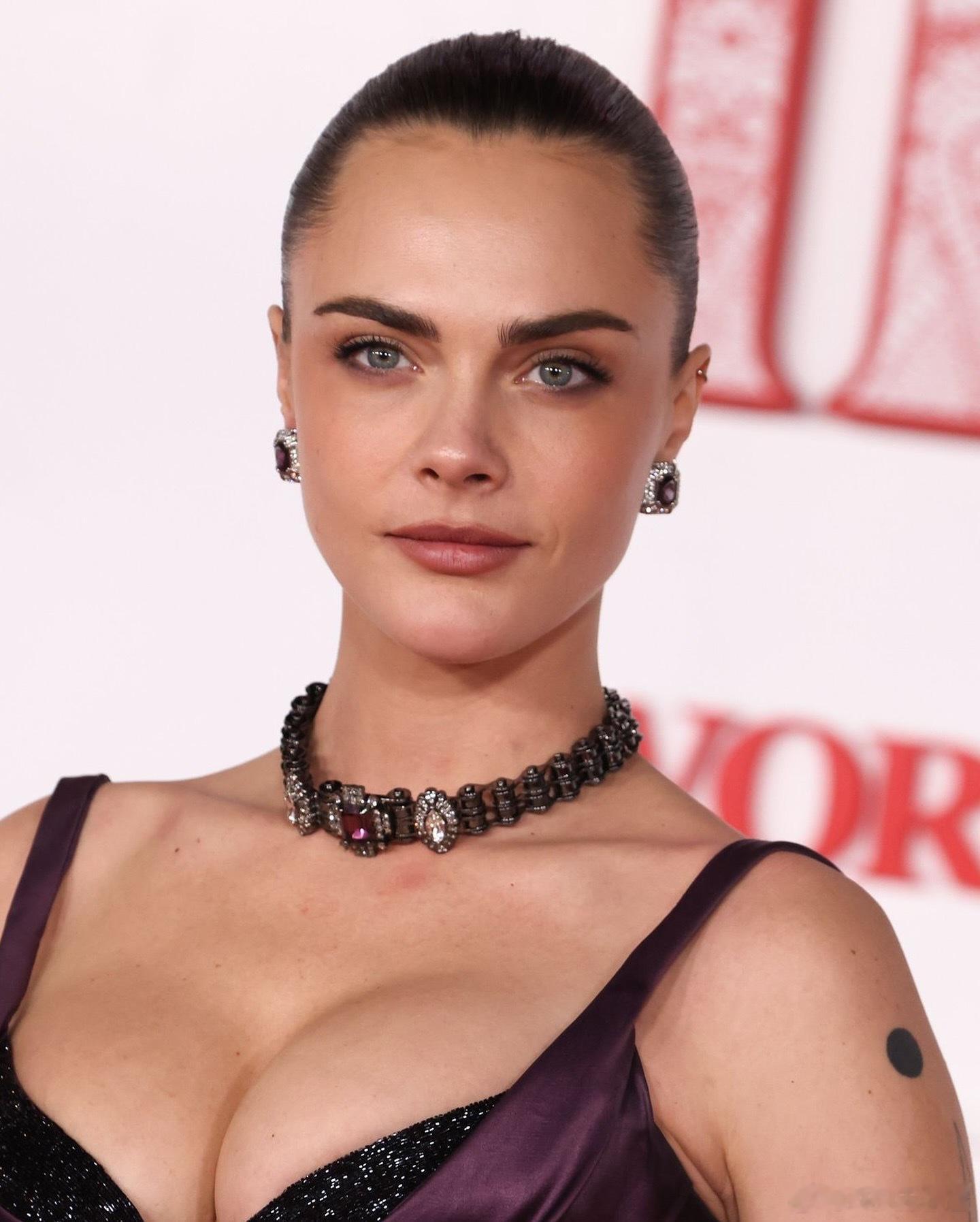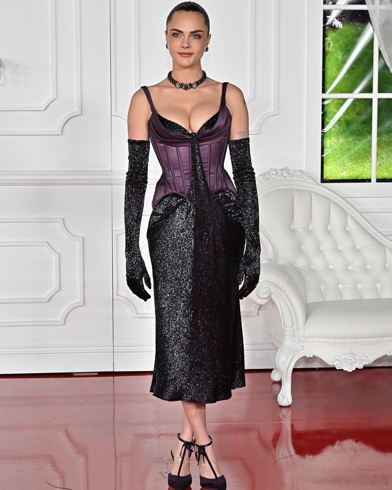 Cara Delevingne 出席电影《呼啸山庄 Wuthering Heights》首映礼,穿了一条Wiederhoeft 的礼服裙,她的胸有这么夸张吗