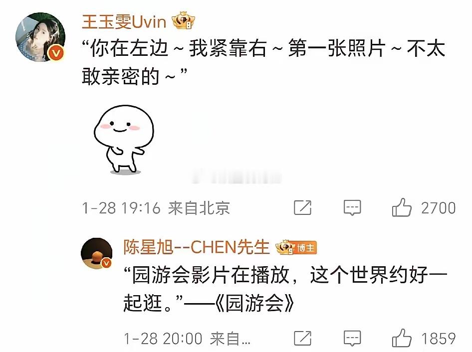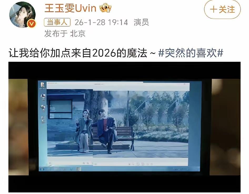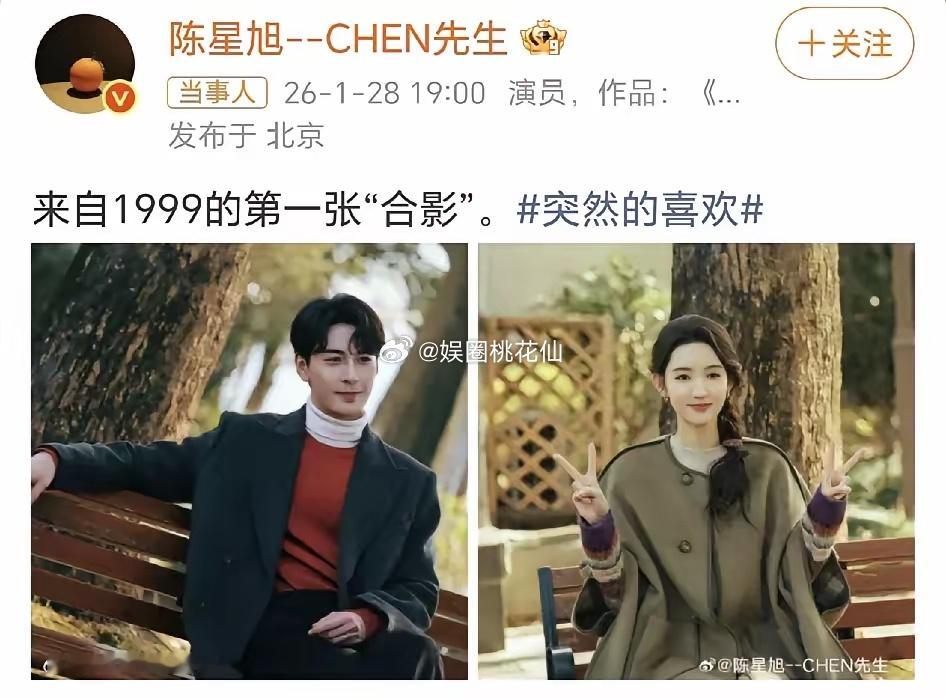 陈星旭和王玉雯晒了组跨越时空的照片,用来宣传新剧呢!1月28号,陈星旭在社交平台发了两张照片,一张是他自己的,一张是王玉雯的,还配文说:“来自1999的第一张‘合影’。”哇哦,这宣传方式刚好和他俩新剧《突然的喜欢》里男女主跨越时空的设定对上了,还挺有创意的。王玉雯在评论区留言互动,陈星旭回复的时候还用上了周杰伦的《园游会》,有点可爱哦。王玉雯也在社交平台晒了她和陈星旭的合照,配文:“让我给你加点来自2026的魔法~”剧还没播呢,就已经感觉到甜丝丝的了。陈星旭在评论区说:“感谢2026的手搓大师送来的新合照。”感觉这部剧之后说不定能冒出不少新梗呢,之前王玉雯算不算是反向操作呀?