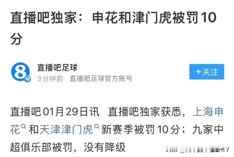 申花争冠无望!申花和天津,根据多家媒体都报道,1月19日上午进行的新闻发布会上公布的名单里,这两家俱乐部罚分最重,各扣10个联赛积分。 其他球队的罚单也跟着出来。中超海牛7分,河南、山东各6分,浙江、国安、海港、三镇都是5分。中甲的亚泰4分,梅州3分。 最让人觉得讽刺的是,申花和天津,上赛季还被足协评了“公平竞赛俱乐部”。这就有意思了,一边拿着“公平”的奖状,一边因为“不公”的事挨罚。 这反差,像给脸上贴了金又被一巴掌打下来,火辣辣的。罚分不是小事,10分对任何球队来说,都是赛季计划里的大窟窿。 想争冠的,可能直接退出赛道;想保级的,得从头就绷紧神经。可比起“公平竞赛”的招牌被自己砸了,这点损失或许还算轻的。 球迷怕是更难接受,上赛季还为“公平”的荣誉骄傲,这赛季就因为“假赌黑”被罚分。那种从期待到失望的落差,比球队输球还难受。 足球场上,“公平”二字重千斤。评上“公平竞赛俱乐部”,本该是约束自己的警钟,不是可以松懈的挡箭牌。申花和天津这事儿,更像个提醒:荣誉拿得再高,一步踏错,就可能前功尽弃。 其他被罚的球队也一样,5分、6分、7分,数字背后是对规则的漠视。平时喊着“尊重足球”,真到了考验面前,却没能守住底线。 这次处罚,不只是罚分那么简单。是给所有俱乐部提个醒:“公平竞赛”不是嘴上说说,是场上场下都得守住的规矩。拿了荣誉更该珍惜,不然,摔得只会更惨。 申花和天津的尴尬,该成整个联赛的镜子。照照自己,是不是真的把“公平”刻在心里。不然,今天的罚分,可能就是明天更重的代价。