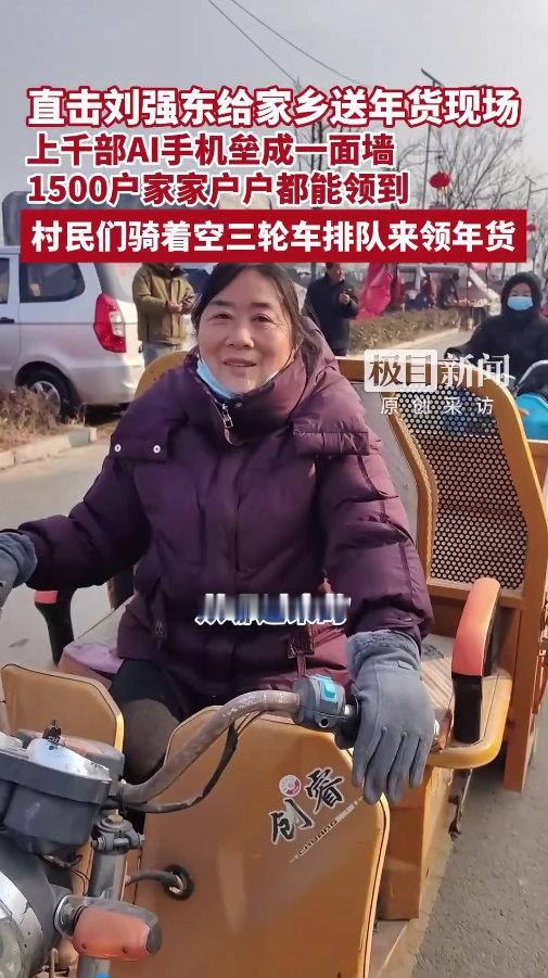 村民骑空三轮拖刘强东送的年货 村里的空三轮车被挨个填满,满满当当都是送来的年货,现场上千部手机垒成一面墙,这份实在的心意,暖了整个村落的冬日。刘强东送年货上千部手机垒成一面墙