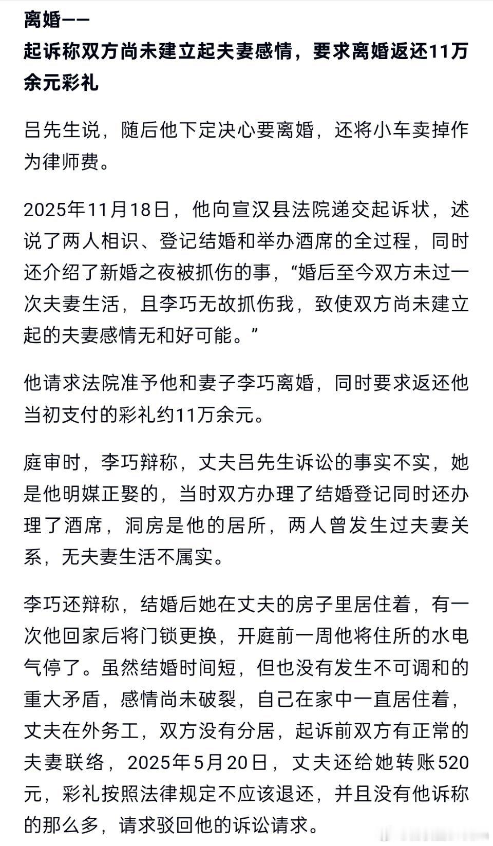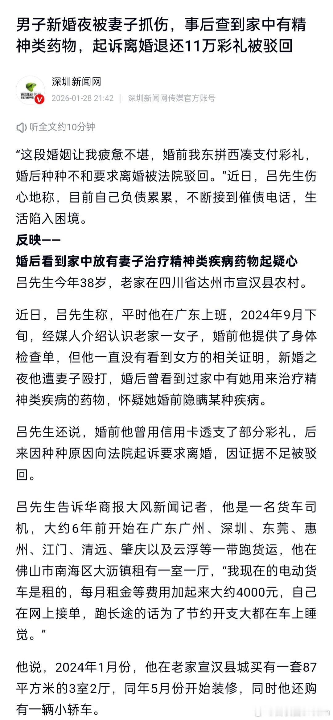 总结:男方被女方家暴。女方隐瞒婚前患有精神疾病。男方是男货车司机,跑长途,在车上睡觉。男方起诉离婚退还11万彩礼被驳回。男子新婚夜被妻子殴打发现其患精神病