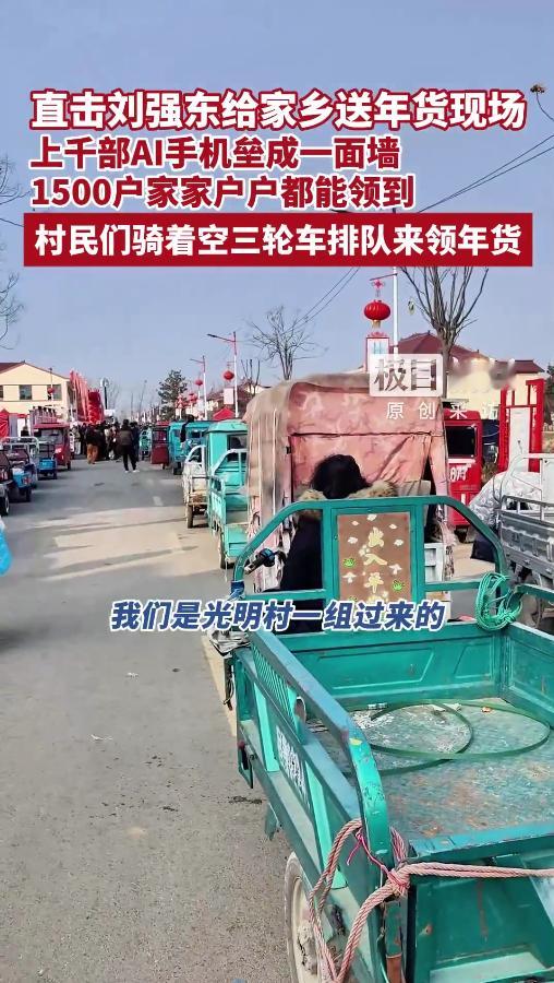 村民骑空三轮拖刘强东送的年货空三轮满载年货而归,千部手机筑起温情长墙,点滴暖意浸润乡野,岁岁帮扶暖人心扉,质朴欢喜间,皆是藏不住的暖心与烟火温情。刘强东送年货上千部手机垒成一面墙