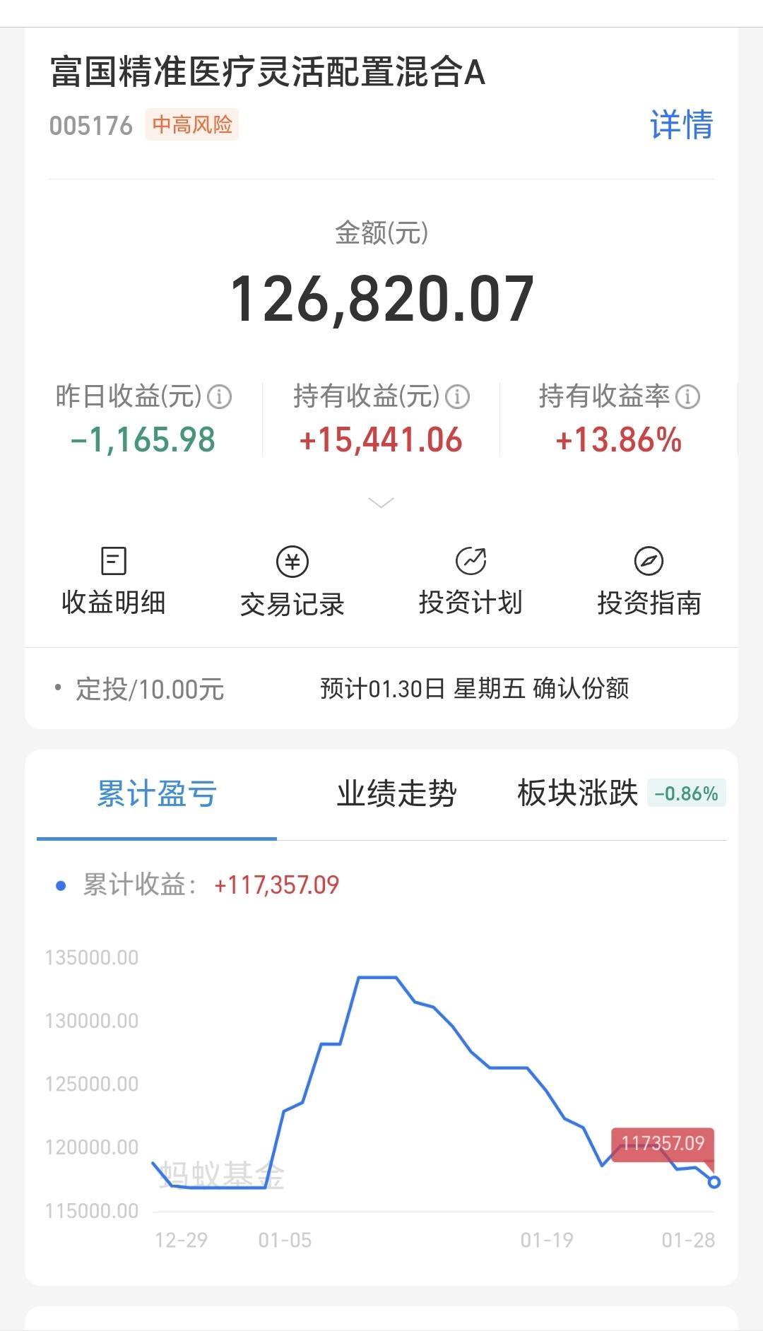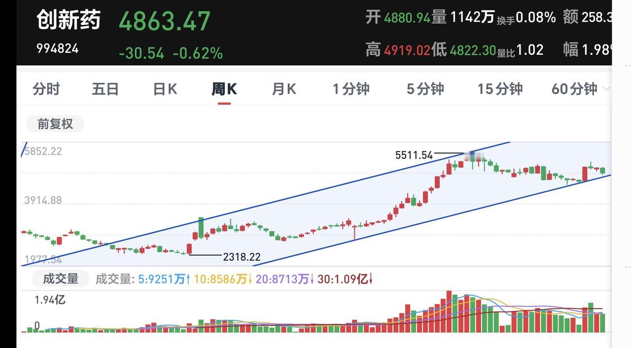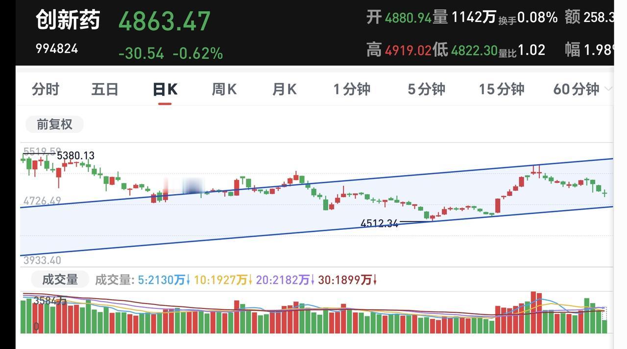 基金:创新药板块是考虑进场还是离场 今天白酒板块大涨,让许多人对创新药板块充满了想象,创新药板块比白酒板块要好很多,这个板块去年有过阶段性上涨,只是有许多人没有能够及时止盈,只是有许多人在高位追涨进场,就造成了现在的亏损,而白酒板块是连续下跌了五年,那是在历史高位的时候,没有能够及时止盈,那是在后面的进场过程当中,进在了半山腰,创新药板块是新债,白酒板块是老债,不管怎么样,每个板块都会有它的春天,每一个花朵都有它盛开的季节,只是不同的花朵,花期不一样而已,不同的板块,上涨的时段不一样而已。 看下面的截图1,今天创新药板块下跌了0.83%,这个板块持有人数在所有板块当中排名第10位,散户人数已有所下降,曾经的时候,这个板块的持有人数是很靠前的,就像白酒板块一样,最近它的持有人数也在下降,只有把持有人数降下来了,这个板块才能起死回生,而热门板块的持有人数都是很多的,当持有人数达到极限的时候,这个板块也就到了顶部区域。 这个板块今天加仓人数排行榜见下面的截图3,持有人数排行榜见下面的截图4,加仓人数最多的是平安医疗健康混合,持有人数最多的是永赢医药创新智选混合。 看下面的截图5,这是创新药板块日K线图,现在的位置处于这个上涨通道中,距离上涨通道的下轨线比较近,在这个上涨通道下轨线附近是一个短线进场点。 看下面的截图6,这是创新药板块周K线图,现在的位置也是距离周线级别上涨通道下轨线比较近,说明这个板块向下下跌的空间已经不大,在周线级别上涨通道下轨线附近,是长线持有者的进场点。 我前面的文章中讲,如果近期市场指数上涨到4190点附近,也就是前高的附近,我会考虑再一次止盈。有朋友问我,止盈的时候会不会止盈白酒板块和创新药板块,这两个板块大概率不会止盈,这两个板块都是在等等待进场的机会。 看下面的截图7,这是创新药板块基金富国的持有情况,持有金额126820元,持有收益15441元,持有收益率13.86%,累计收益117357元,每天定投10块钱。 这个板块的基金,我基本上都是利润在里面飞,这主要是我在前期进行过止盈,进行过多次止盈之后,累计收益金额会越来越大,到了一定的程度,就会接近甚至是超过持有金额,这样的情况下,你的持有心态会很不一样,你既然拿得住,也能放得下,你既然承受上涨,也能接受下跌。 花一秒钟点赞,花30秒钟评论是对我最大的支持,但很多人都不肯花这31秒钟。