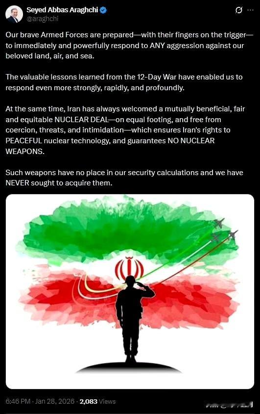 伊朗外交部长阿巴斯·阿拉格奇: 我们英勇的武装力量已严阵以待——手指扣在扳机上——随时准备对任何针对我们亲爱的陆地、领空和领海的侵略行为作出迅速有力的反击。 从“十二日战争”中汲取的宝贵经验,使我们能够以更强有力、更迅速、更深刻的方式作出回应。 与此同时,伊朗始终欢迎达成一项互利、公平、公正的核协议——在平等基础上,不受胁迫、威胁和恐吓——既保障伊朗和平利用核技术的权利,又确保不研制核武器。 此类武器在我们的安全考量中毫无立足之地,我们从未寻求获取过此类武器。