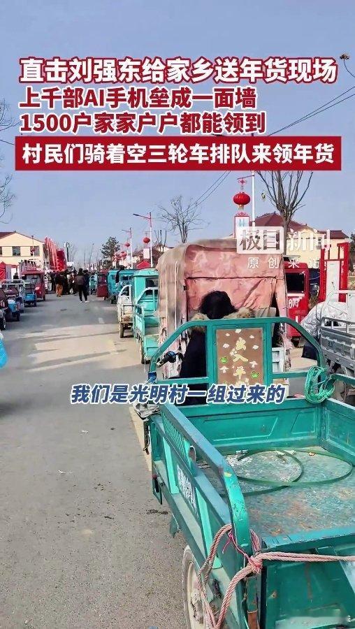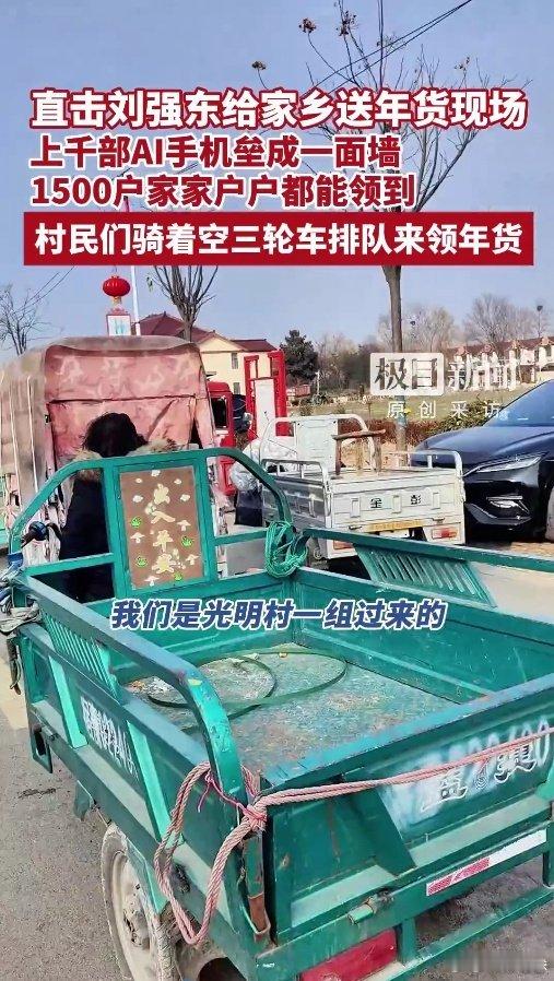 村民骑空三轮拖刘强东送的年货 又是一年年味儿到来,光明村的年味被刘强东承包了呀,真的就是福利满满。刘强东送年货上千部手机垒成一面墙