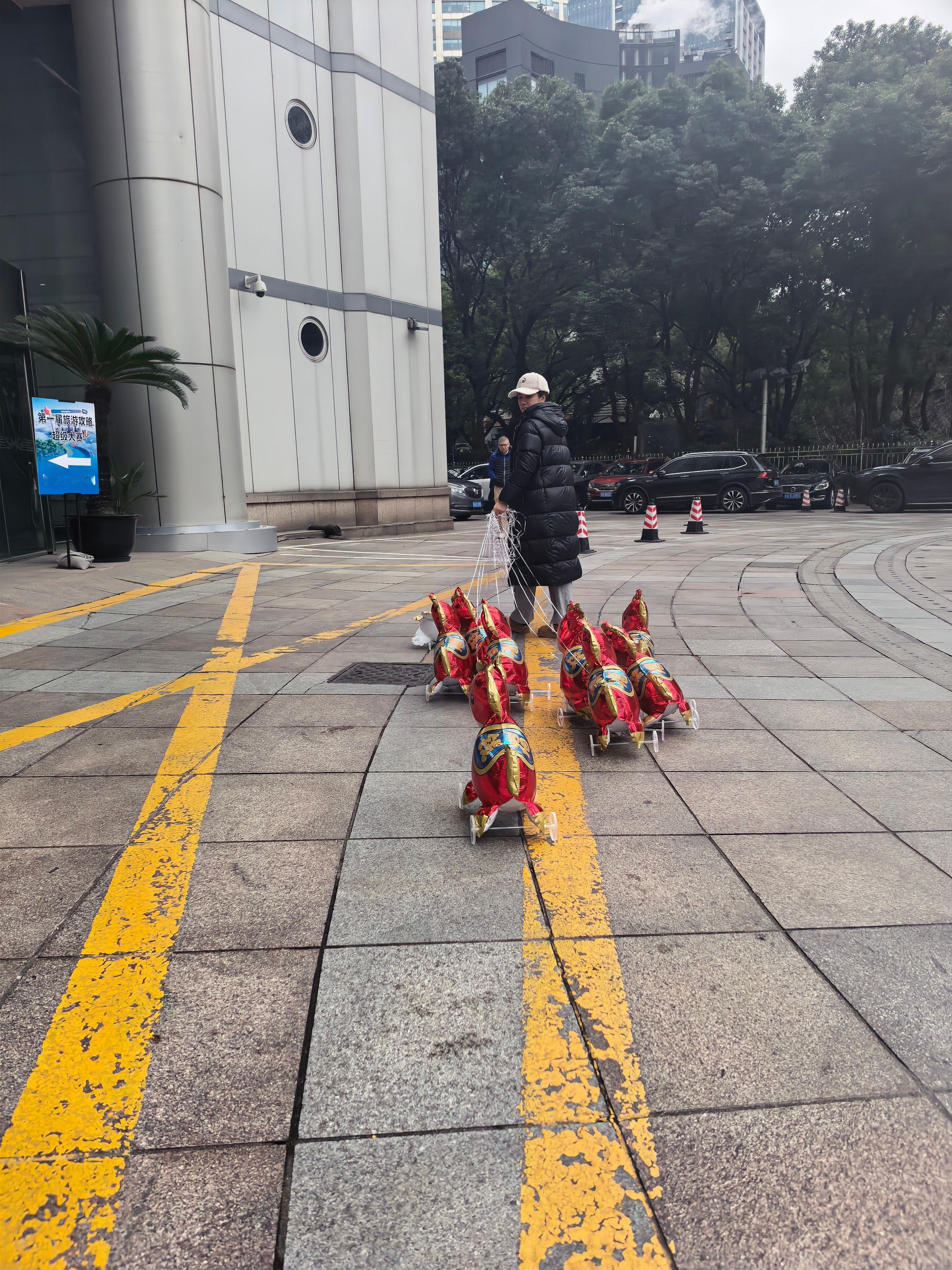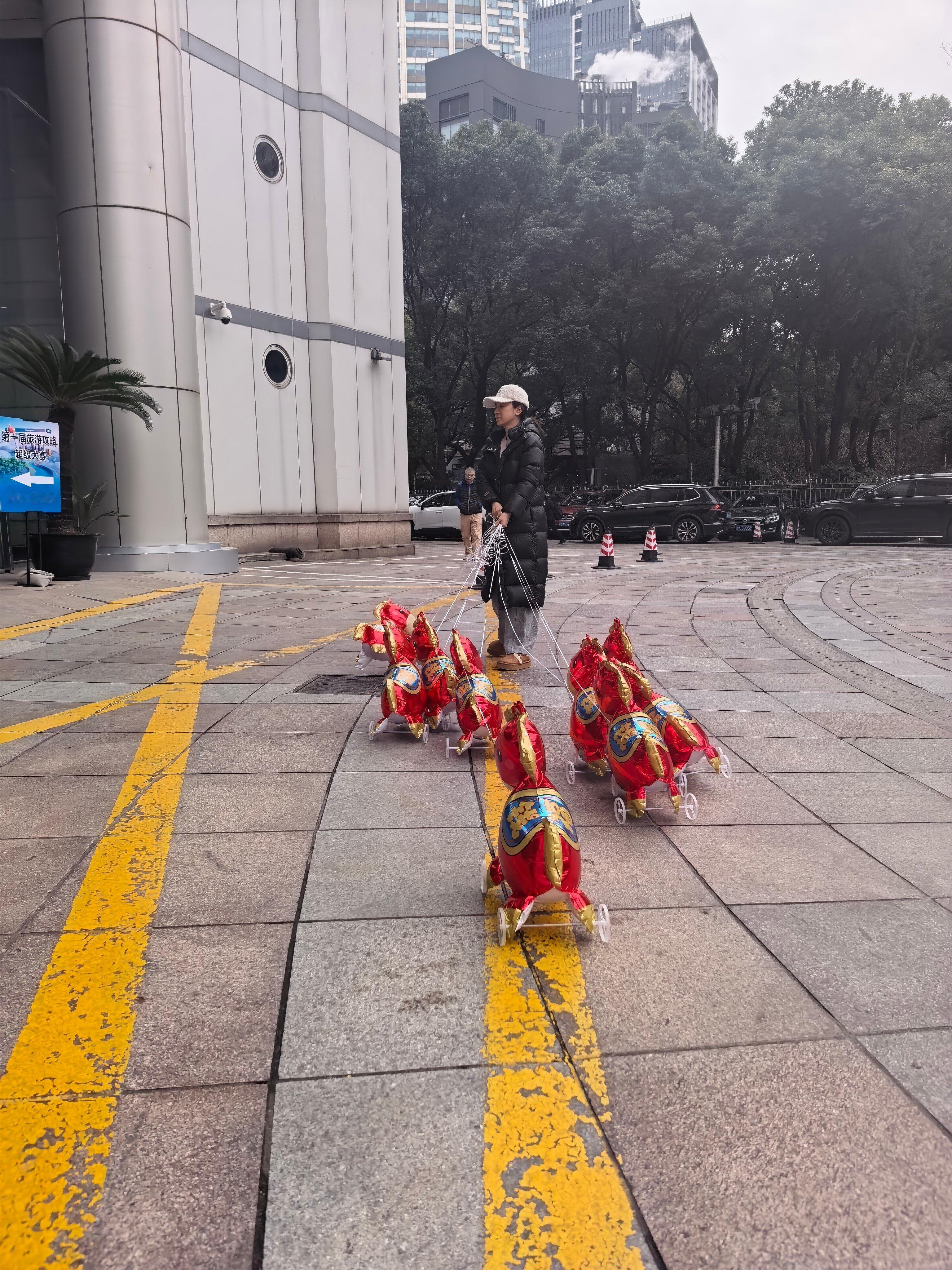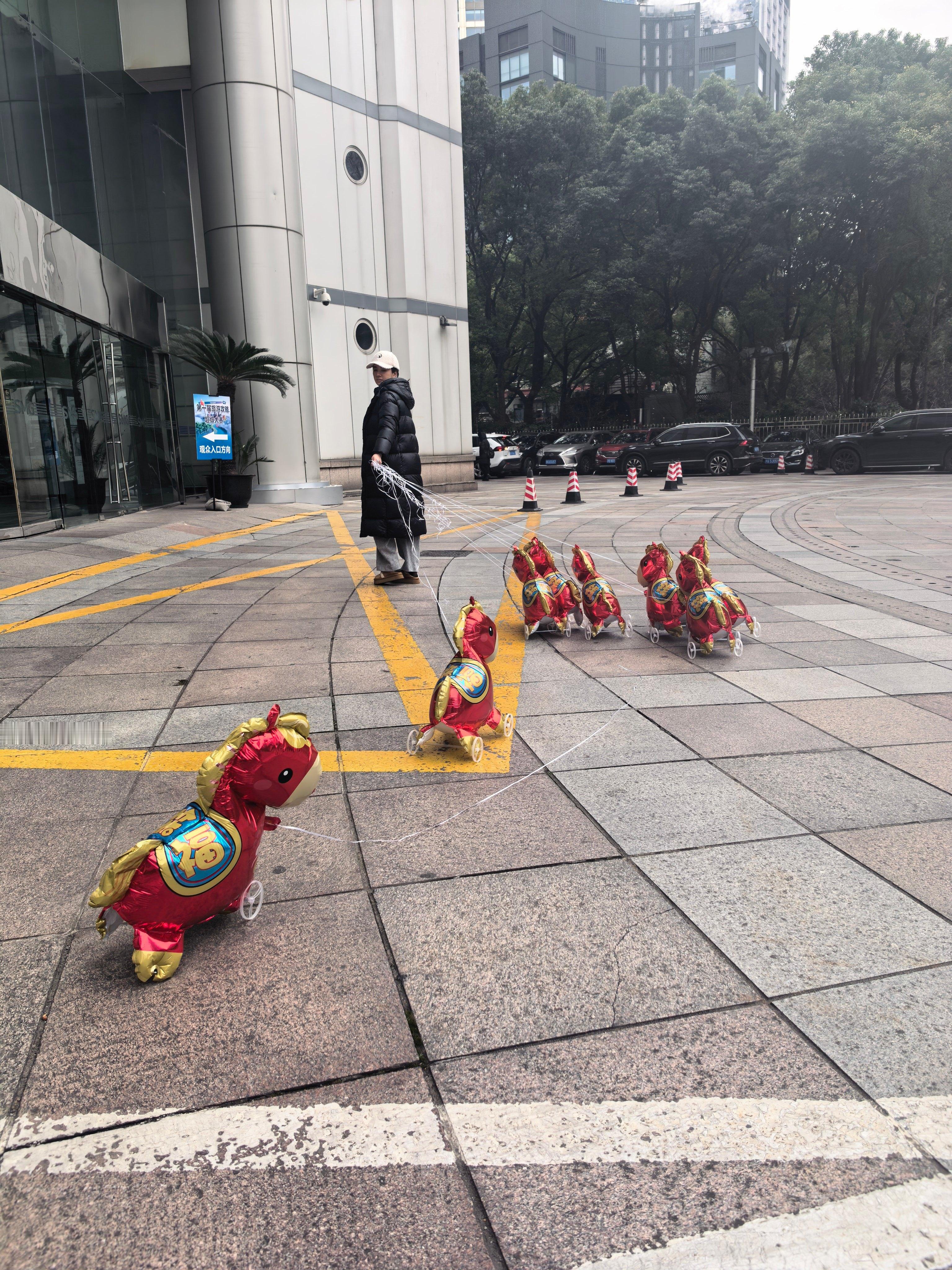 黄奕牵着9匹气球马上班上班路瞬间变成新年许愿池!黄奕牵着的每匹气球马都像一枚浮动