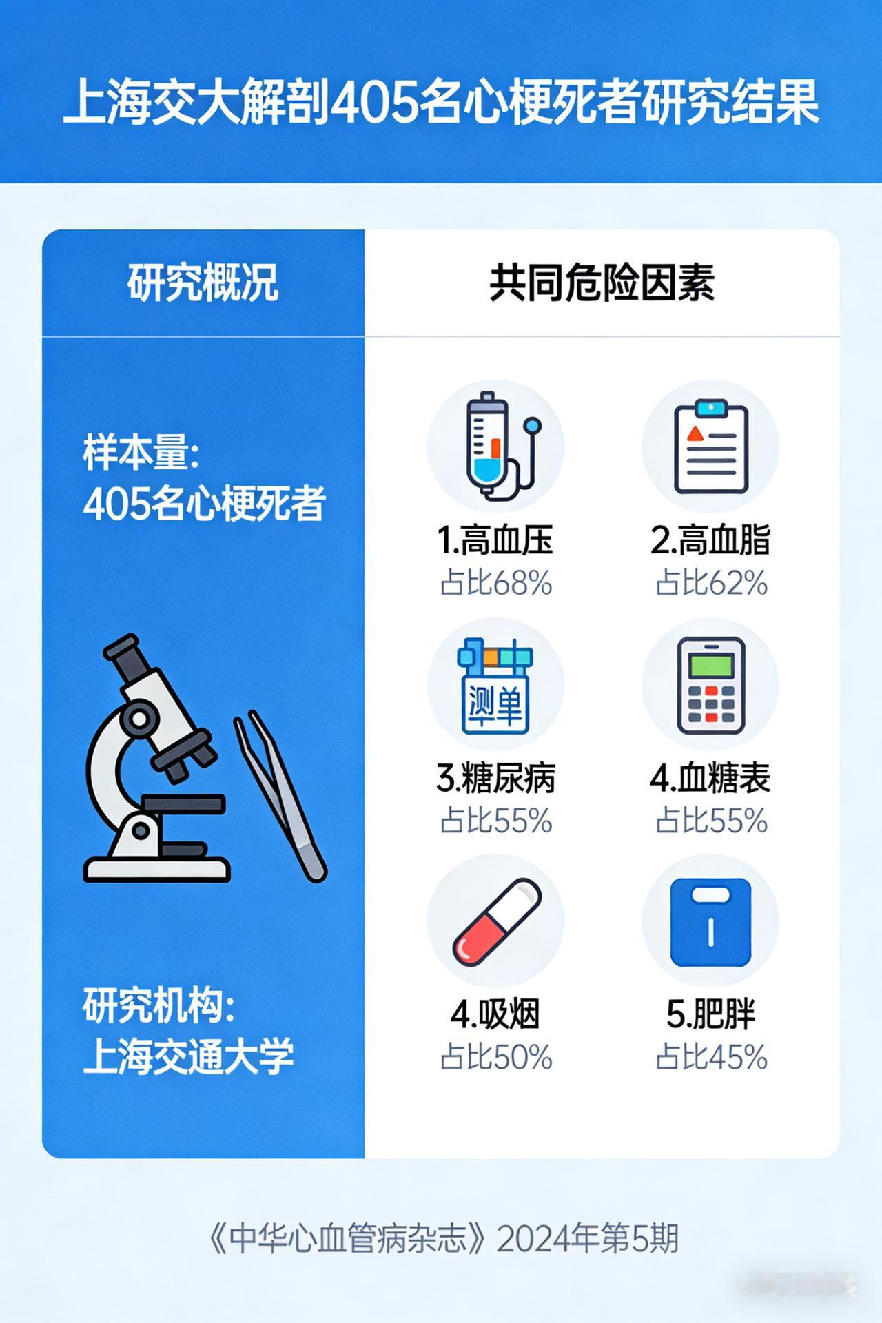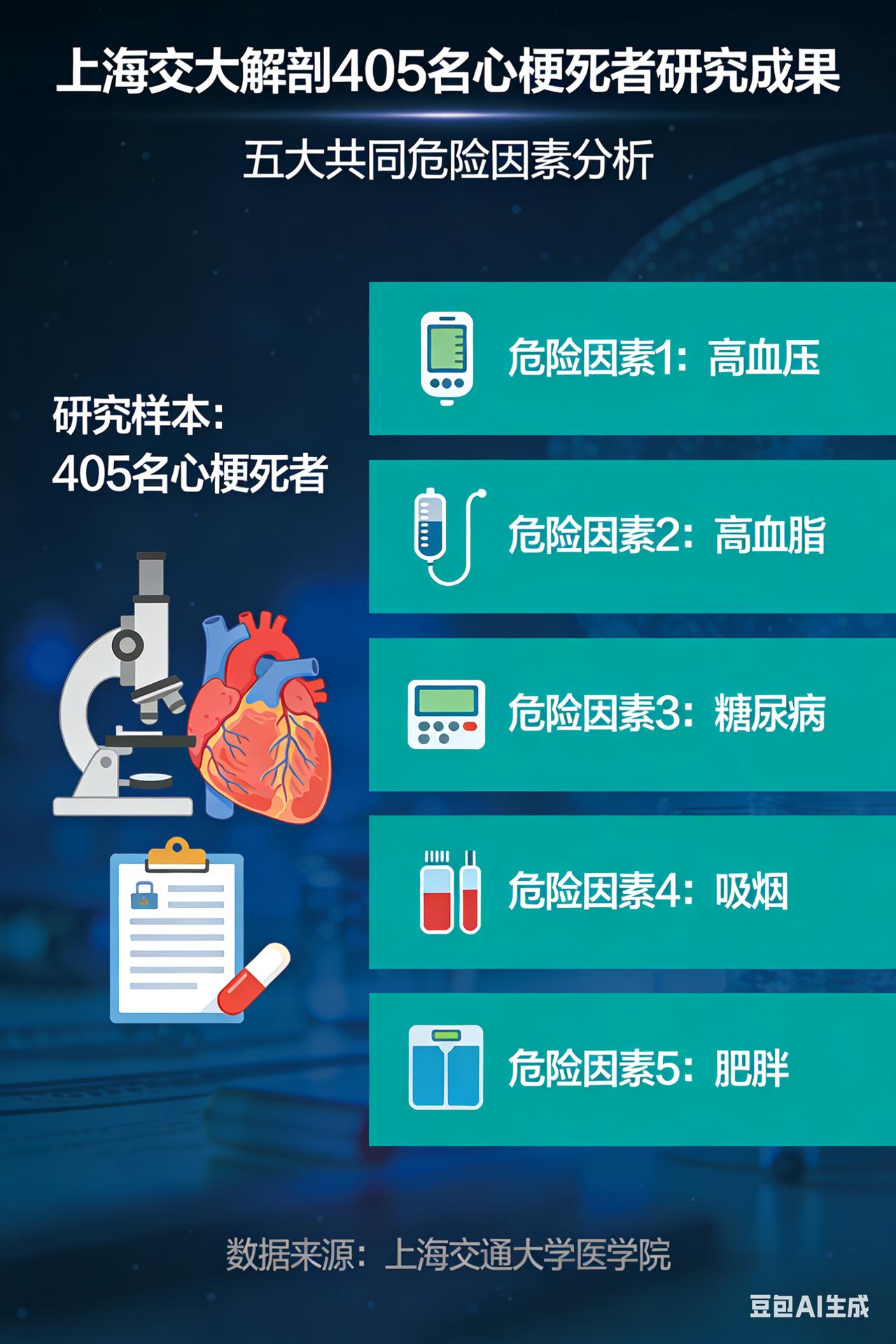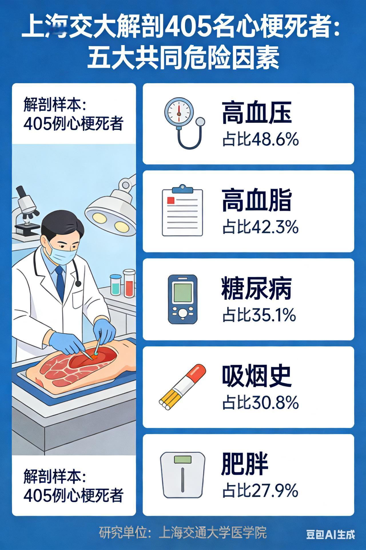 上海交大解剖 405 名心梗死者,发现五大共同危险因素 《惊爆!上海交大解剖405名心梗死者,揭开心梗“共性黑幕”》 近日,上海交通大学附属仁济医院团队一项震撼医学界的研究成果重磅出炉,他们通过对405名心梗死者进行细致入微的解剖分析,如同侦探抽丝剥茧般,挖掘出心梗背后隐藏的诸多惊人共性,为心血管疾病的预防和治疗带来了全新视角与深刻启示。 血管内皮:受损的“生命防线” 在这场对心梗的深度剖析中,血管内皮损伤成为最为突出的共性之一,高达99%的心梗逝者都存在这一问题。血管内皮,本应是血管内壁那层光滑且坚韧的“保护膜”,它默默守护着血管的正常功能,调节血管的舒张与收缩,抑制血栓的形成。然而,在长期的高血压“冲击”、高血脂“侵蚀”以及烟草中有害物质的“毒害”下,这层防线逐渐千疮百孔。一旦血管内皮受损,就如同打开了潘多拉的魔盒,血小板会迅速聚集,形成血栓,随时可能堵塞血管,引发致命的心梗。这一发现让我们意识到,保护血管内皮,就是守护生命的通道。 慢性炎症:隐匿的“健康杀手” 慢性炎症反应在心梗人群中几乎无处不在,95%患者体内CRP和IL - 6等炎症指标长期居高不下。这种慢性炎症就像一个狡猾的“潜伏者”,悄无声息地在体内肆虐。它并非由急性感染引起,而是长期不良生活方式、环境污染等多种因素共同作用的结果。慢性炎症持续不断地侵蚀着血管壁,促进动脉粥样硬化斑块的形成和不稳定。这些斑块就像血管中的“定时炸弹”,一旦破裂,就会引发急性心梗,让人猝不及防。 代谢紊乱:失衡的“身体天平” 代谢紊乱也是心梗的常见共性,83%患者伴有胰岛素抵抗、血糖调节异常。在现代社会,快节奏的生活和高热量的饮食让越来越多的人陷入代谢困境。胰岛素抵抗不仅会导致血糖升高,还会引发血脂异常、血压升高等一系列问题,形成代谢综合征的“恶性循环”。这个“循环”就像一个无形的枷锁,紧紧束缚着我们的心血管健康,大大增加了心梗的发生风险。 肠道菌群:被忽视的“健康密码” 肠道菌群失衡这一共性同样不容忽视,80%患者肠道益生菌减少、致病菌过度繁殖。肠道菌群,这个曾经被我们忽视的“微生物世界”,如今被发现与心血管健康息息相关。它通过“肠 - 心轴”与心血管系统进行着密切的沟通。失衡的肠道菌群会产生有害代谢产物,这些产物进入血液循环后,会引发炎症反应和氧化应激,加速心血管老化,为心梗的发生埋下隐患。 氧化应激:过度的“自由基风暴” 氧化应激长期高企也是心梗的重要共性,75%患者体内自由基水平异常。自由基是人体代谢过程中产生的副产物,正常情况下,人体自身的抗氧化系统会将其清除。然而,长期熬夜、吸烟、缺乏运动等不良习惯,会使自由基产生过多,超出抗氧化系统的清除能力。过多的自由基就像一场“风暴”,在体内肆虐,导致血管内皮损伤、炎症反应加剧,成为心梗的“帮凶”。 上海交大这项研究犹如一盏明灯,照亮了心梗预防和治疗的道路。它提醒我们,心梗并非不可预防,只要我们从改善生活方式、调节代谢、维护肠道菌群平衡等多方面入手,积极应对这些共性因素,就能有效降低心梗风险,守护自己和家人的心血管健康。让我们行动起来,远离心梗的威胁,拥抱健康美好的生活!