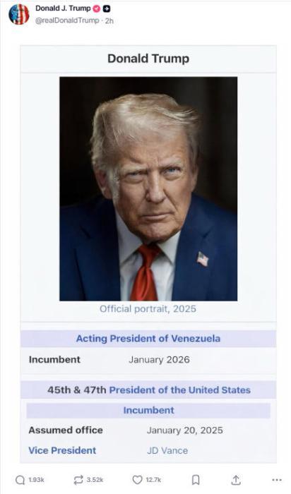 当地时间1月11日,特朗普在自己的“真实社交”平台发布了一张图片。上面显示维基百科网站的特朗普页面,其肖像照下方的人物身份栏标注“委内瑞拉代总统,任期自2026年1月起”。