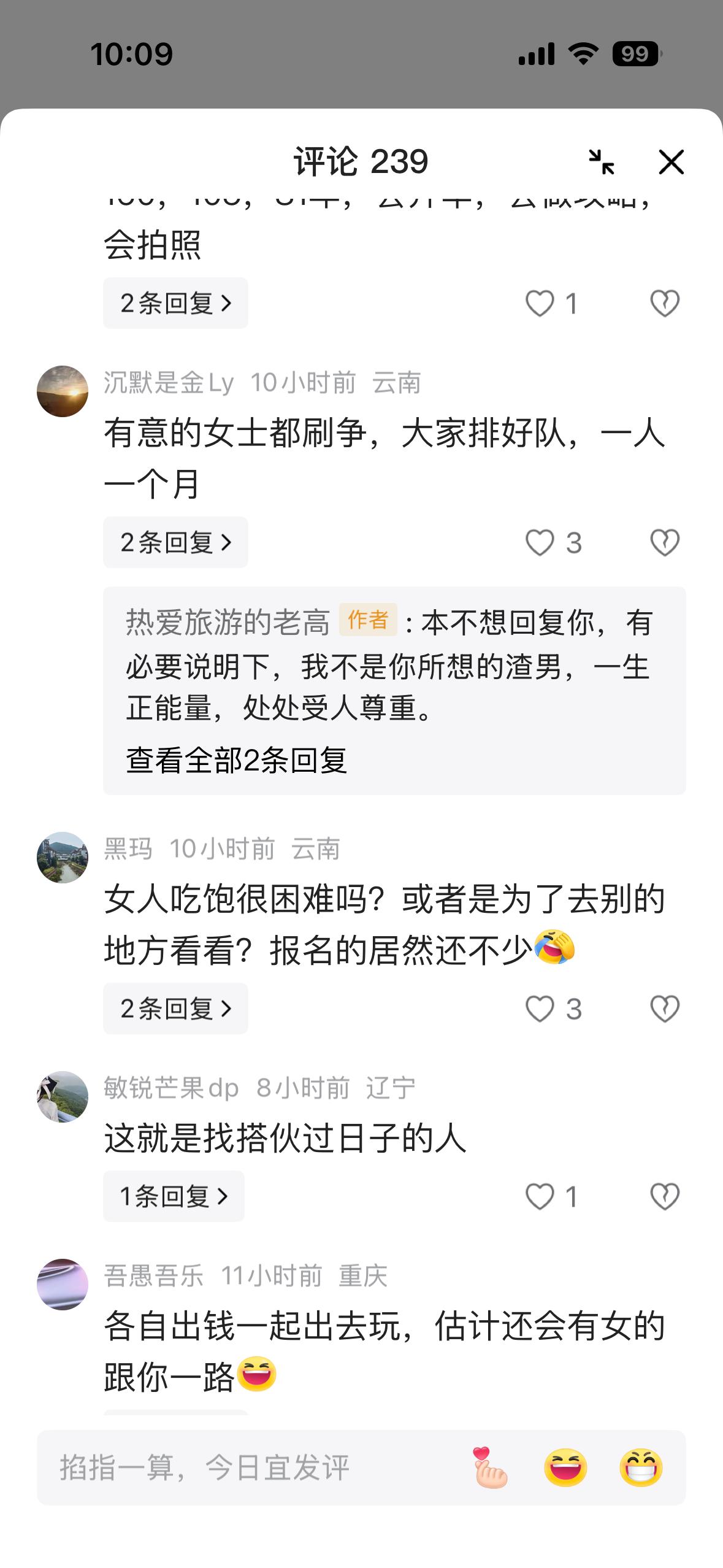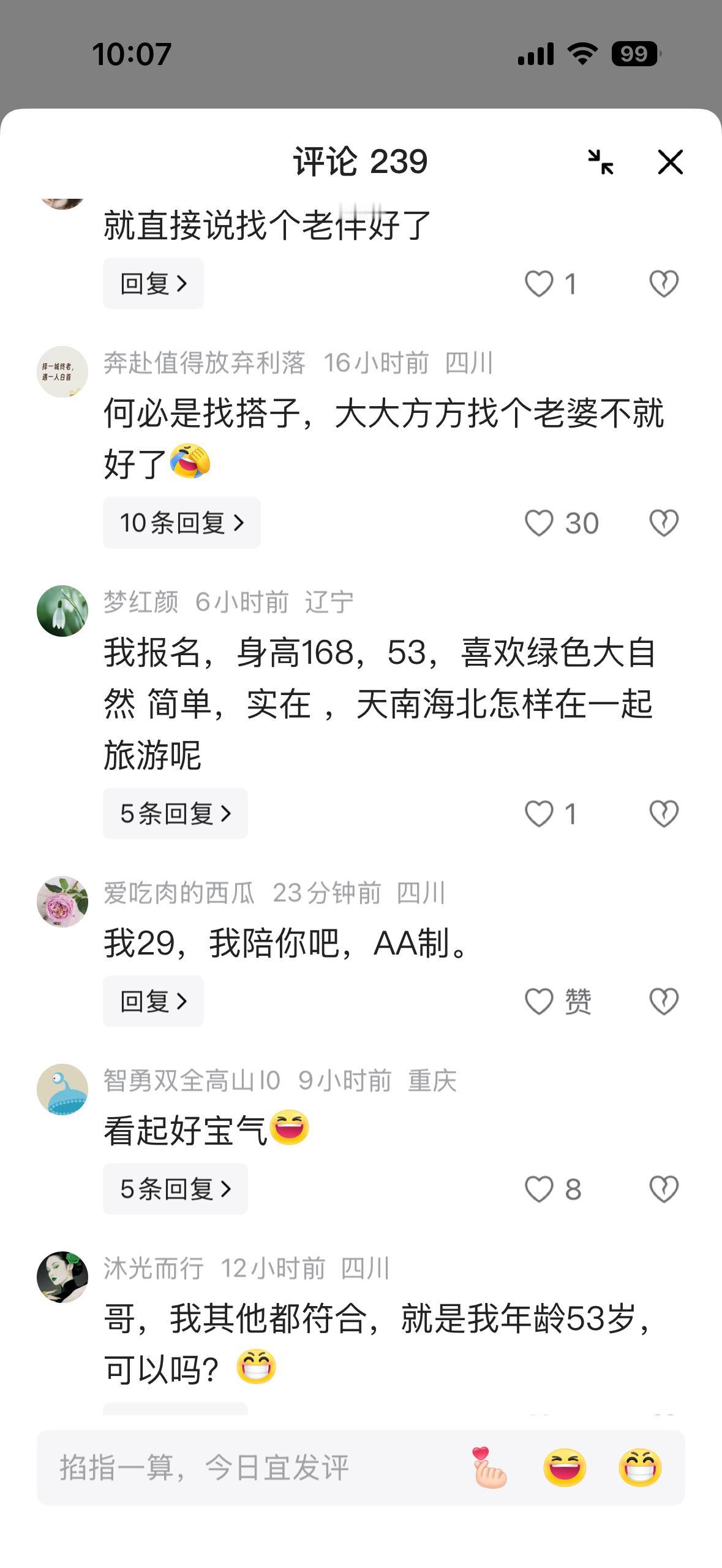 你怎么看旅游搭子? 我认为的旅游搭子就是纯粹一块旅游,一起走一段路。 而头条人们征的旅游搭子,我怎么看怎么像是征老伴儿。 征老伴儿就直接说是征老伴儿。 说什么旅游搭子? 旅游搭子你要求什么身高体重?还要求什么性格,做饭? 我搞不懂为什么非要借旅游搭子之名征老伴儿? 是正常找老伴儿找不到吗? 我也奇怪还有那么多应征的。 是看不出来对方意图,还是应征的也想找老伴儿? 在我看来这更像是试婚。 如果试婚,找老伴儿不应该要求对方的体检报告吗?不怕对方有传染病吗? 万一对方是乙肝肺结核之类的呢? 看来人家是心真大。 好吧,世界之大,无奇不有。 存在即是合理。 朋友们,你们会找旅游搭子吗?
