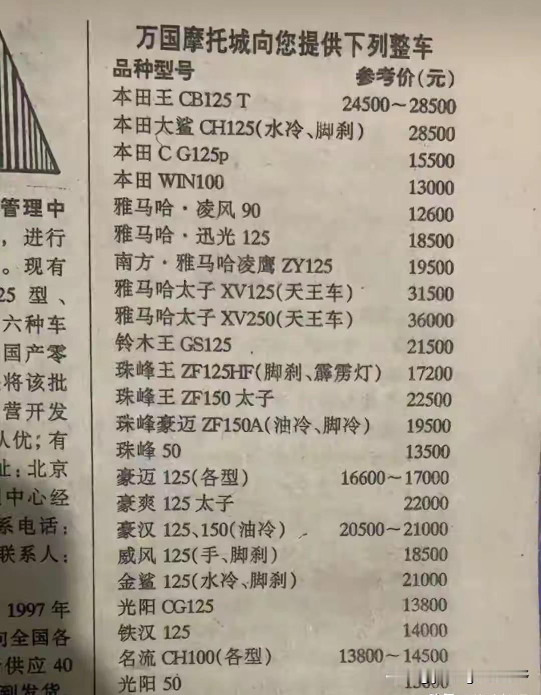 90年代末,2000年代初,报纸上的摩托车销售广告。那时的摩托车就好像是今天的小汽车,成为那个年代家庭热门的交通工具。那个年代人们收入普遍不高,大部分人一个月工资甚至不足一千元,那时候一辆摩托车好的要两三万,一般的也要四五千。那时买上一辆摩托车也算是比较奢侈的物品了,能有一辆摩托车出门都省力多了。