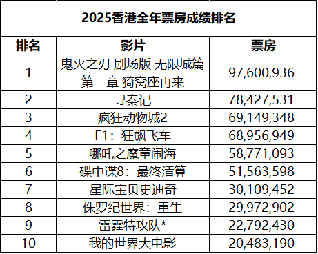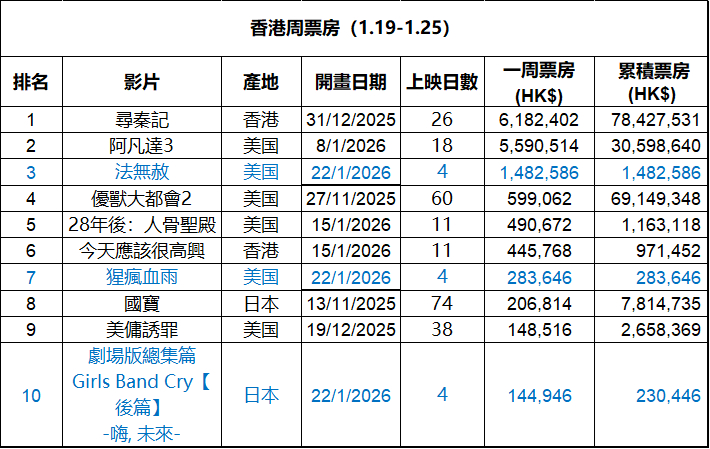 2026年第4周香港票房 :1.《寻秦记》四连冠,累计票房7842万排名香港影史第27;2.《极限审判》在新片中表现最佳;3.《疯狂动物城2》累计票房6914万超越《F1》排名2025年度第2,香港影史第36。(数据:香港贸发局)