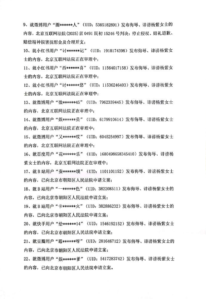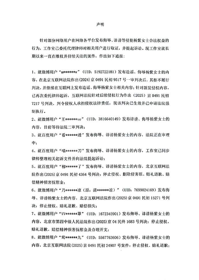 【杨紫方公布维权进展】29日,发文公布维权进展:针对部分网络用户在各网络平台发布侮辱、诽谤等侵犯女士合法权益公布的行为,长期以来工作室一直在维权并持续关注。任何侵犯艺人合法权益的主体,工作室及委托律师将依法采取一切措施追究其法律责任。