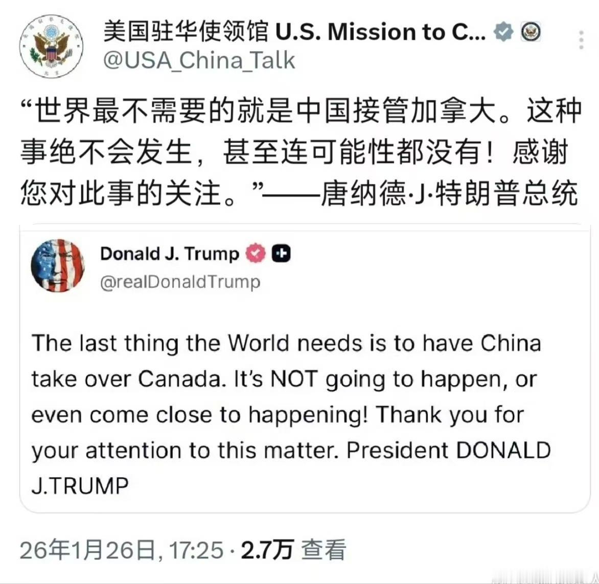 美国大使馆转发特朗普的这么一条推文是什么意思? 特朗普为了接手加拿大可以随便编造一个连外星人都觉得离谱的理由和借口。 网友调侃说, 当美国说让你接管加拿大的时候,你最好真的当仁不让地接管过来, 免得特朗普总是闲言碎语。 因为,所有美国干过的和正在干的坏事,它都会找个替罪羊,并赖在与此毫不相干的别国身上。