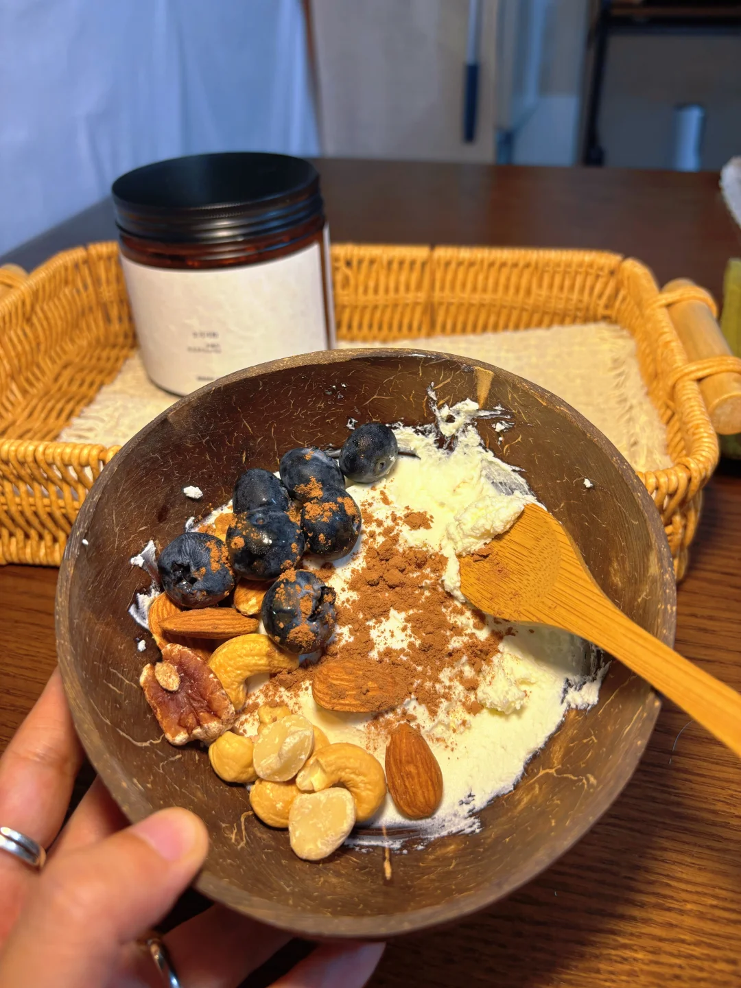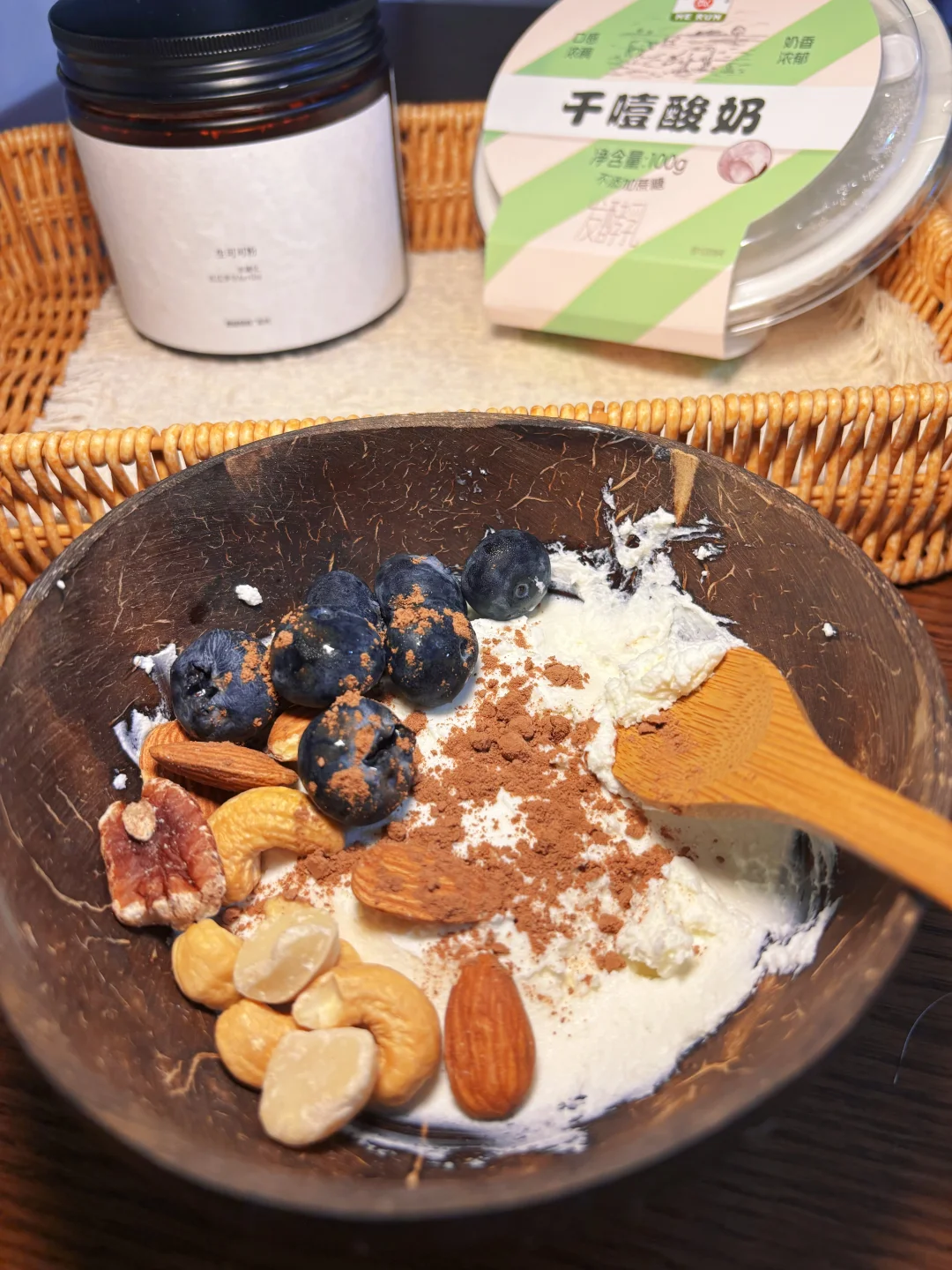这两天不知道怎么了,感染了什么病毒还是咋的,每天特别乏力,流鼻涕打喷嚏嗓子也哑了,而且一点胃口没有。晚上实在吃不下去肉,就吃点干噎酸奶补充蛋白质吧。 这个干噎酸奶可真酸啊,加点可可粉和蓝莓中和一下口味还行。盖住了酸味,剩下了奶味。小猫咪都馋哭了。