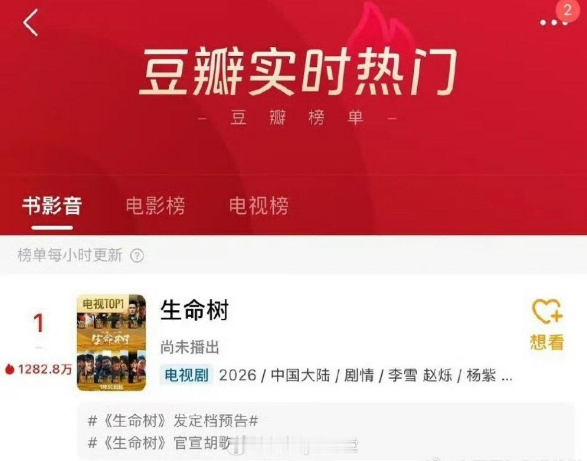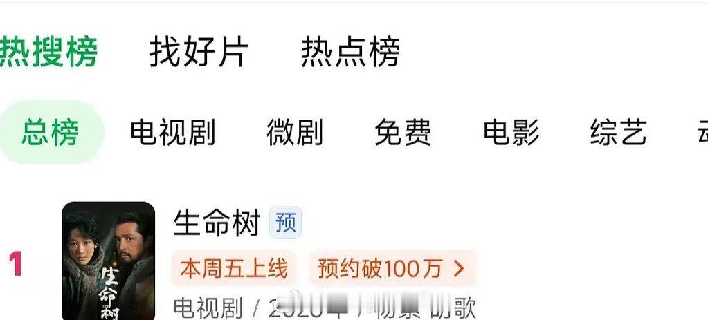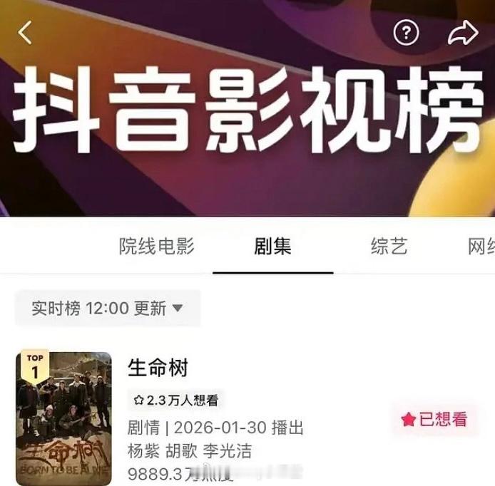 杨紫的《生命树》全平台热度位列第一,是不是能押一个2026第一部爆剧?