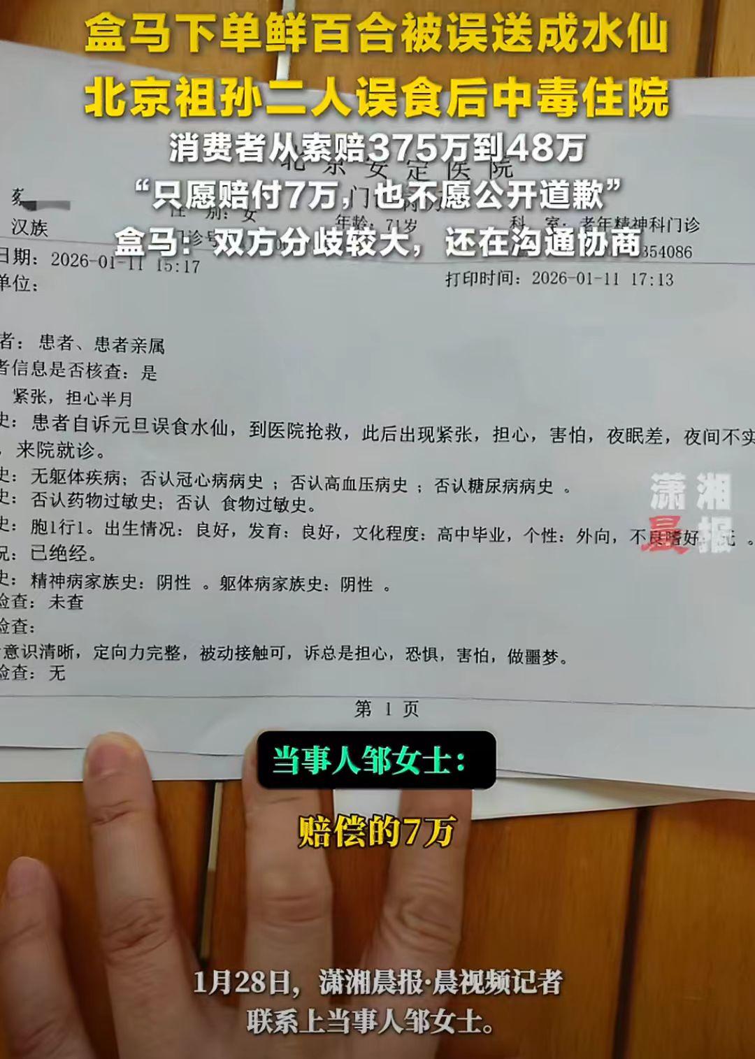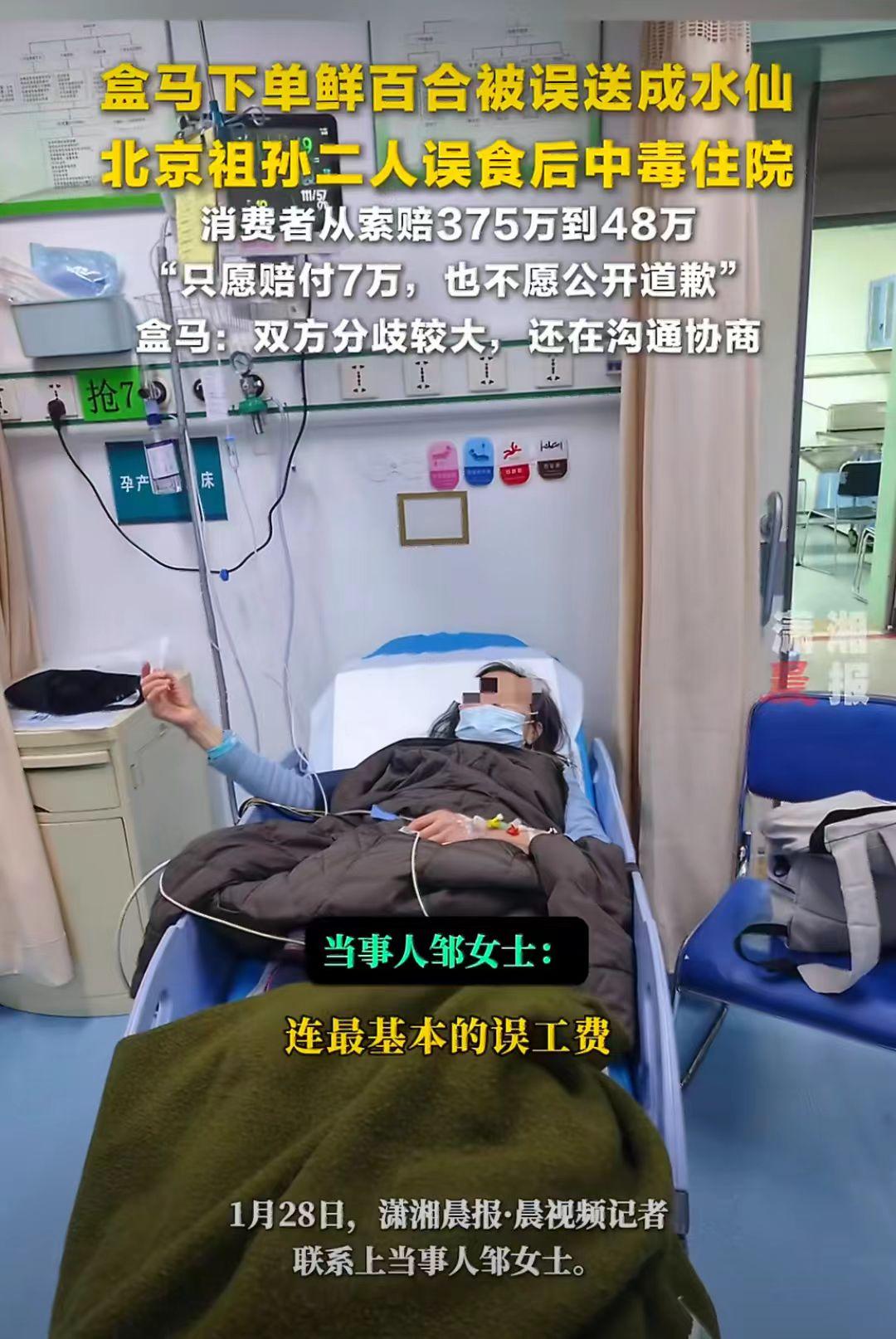 北京邹女士在盒马APP上买了鲜百合。 分拣员把水仙种球当成百合发给了邹女士。 邹女士的妈妈年纪大了没认出来是水仙,包装盒上也没有标注是水仙,老太太就把水仙种球给烧吃了。 邹女士71岁的妈妈和12岁的儿子都中毒了,住了几天院。 1月11日,邹女士和平台联系提出375万赔偿款,盒马平台不同意。 375万确实挺多的,不愿意也很正常。 1月27日,邹女士和平台协商后,提出48万的赔偿方案。 平台还不愿意,说只给7万元赔偿,邹女士说平台还暗示他们也有错(邹女士妈妈)。 一个是花卉,一个是生鲜,怎么能发错呢? 发错货了,不应该先道歉吗?承认错误吗? 这下邹女士不愿意了,觉得平台没有诚意,平台没有公开道歉。 你觉得赔偿48万合理吗?能要的到吗? 水仙 百合 百合生鲜 盒马
