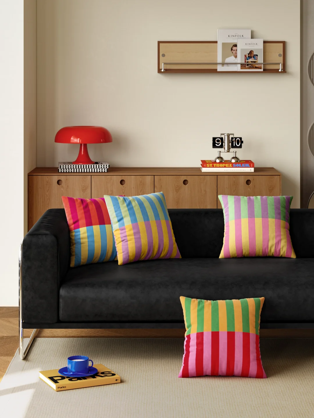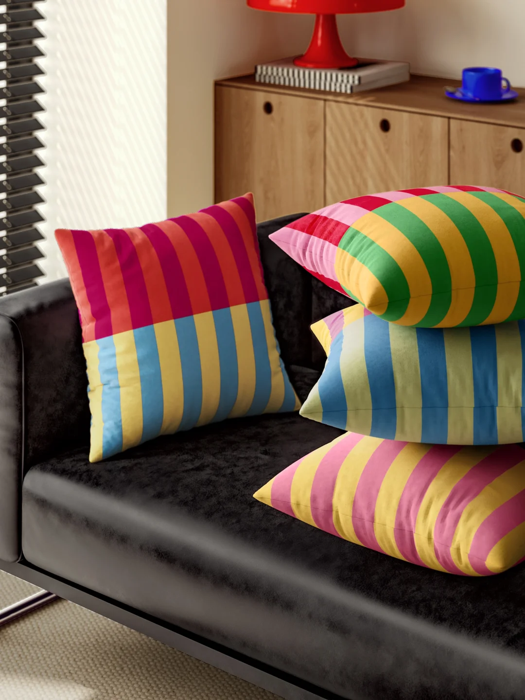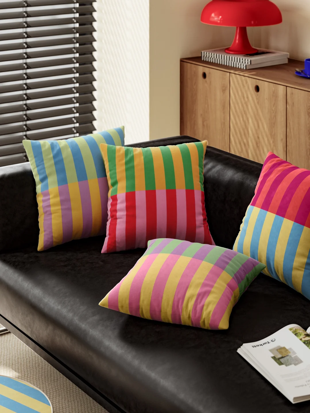 孟菲斯风中古彩撞色 叠搭利落条纹与方块 韵律感十足 简约不单调 还自带艺术感 瞬间给沉闷客厅注入鲜活元气 - 软糯亲肤绒面材质✨ 窝在沙发上靠上去软乎乎的支撑感刚好 追剧午睡都超治愈 隐形拉链设计,拆洗方便又耐用 沙发 / 床品 / 单人椅都适配 轻松 hold 住各种风格,越看越喜欢