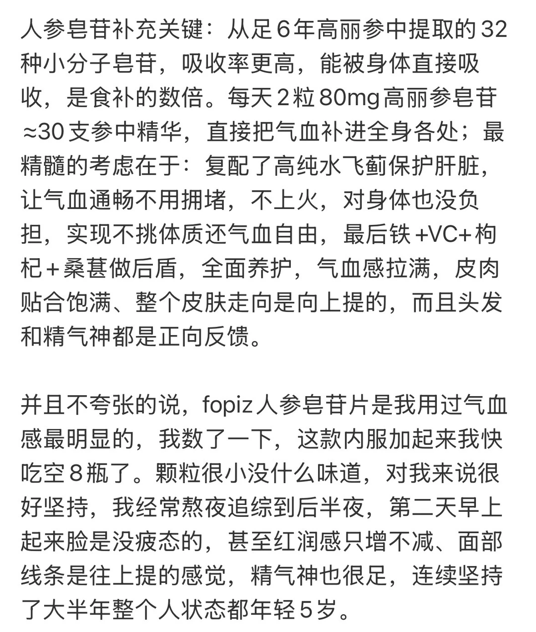 并且不夸张的说,fopiz人参皂苷片是我用过气血感最明显的,我数了一下,这款内服加起来我快吃空8瓶了。颗粒很小没什么味道,对我来说很好坚持,我经常熬夜追综到后半夜,第二天早上起来脸是没疲态的,甚至红润感只增不减、面部线条是往上提的感觉,精气神也很足,连续坚持了大半年整个人状态都年轻5岁。
